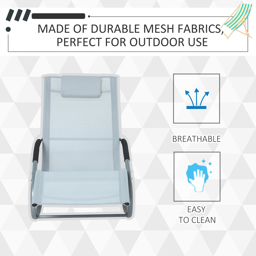 This zero gravity outdoor rocking chair features a durable steel frame and breathable, quick-drying fabric with a removable pillow headrest for neck support. Weather-resistant and smooth-gliding, it ensures comfortable relaxation on patios, decks, or poolside.