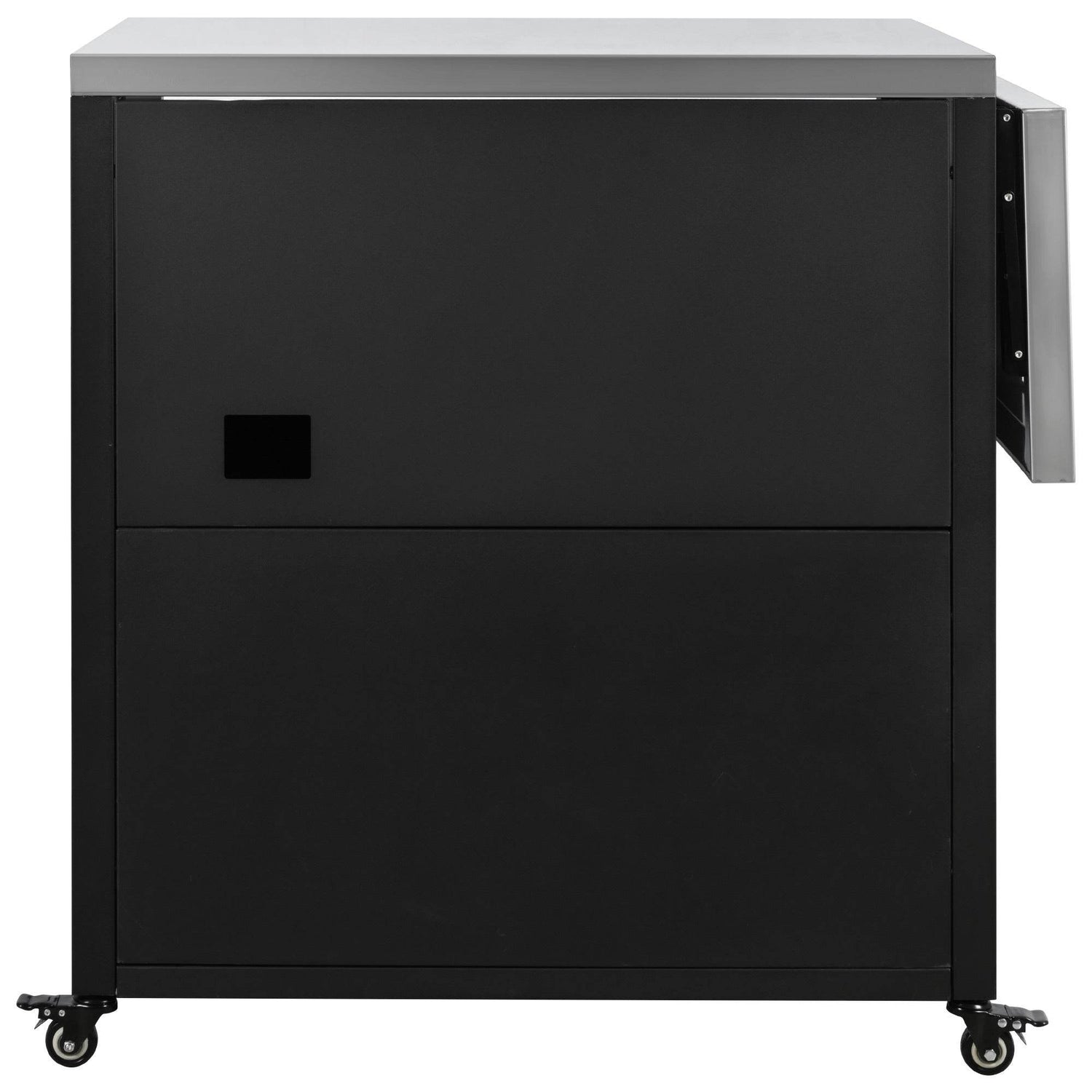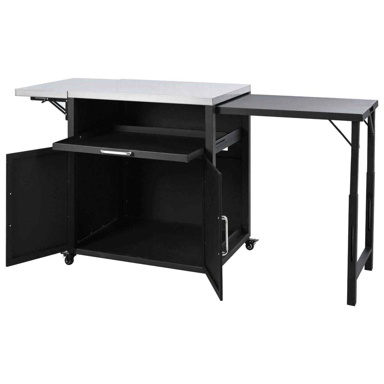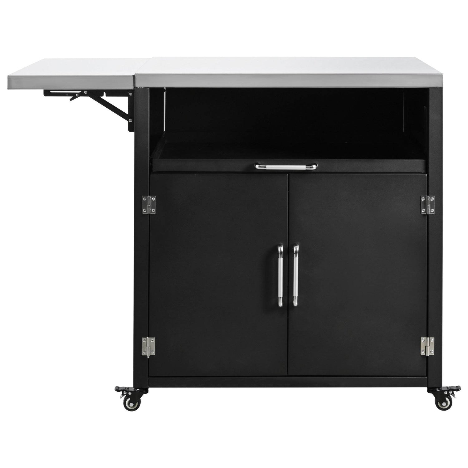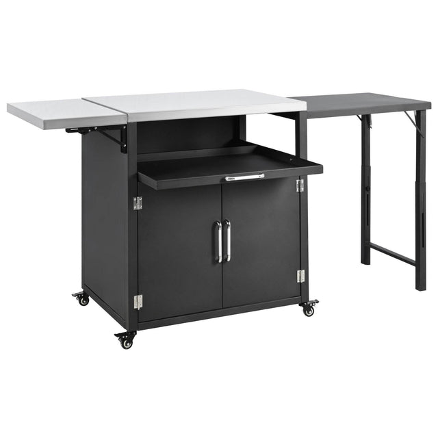 Upgrade your garden or patio with this multifunctional outdoor cabinet designed for durability and flexibility. Featuring a roomy stainless steel tabletop that resists rust and stains, it offers an ideal surface for food prep, grilling, or gardening tasks. The left side includes a foldable table to easily expand your workspace, while the right side features an extendable iron panel for added surface area whenever you need it. Beneath the top, a spacious drawer and a two-door storage cabinet provide ample room to organize utensils, tools, and outdoor essentials, keeping everything within reach. Crafted with a sturdy iron frame and equipped with lockable wheels, this cabinet ensures lasting strength, mobility, and stability in any outdoor setting. Measuring 47.2 inches long, 23.7 inches wide, and 37.4 inches high, it’s the smart, stylish solution to optimize your outdoor activities. Elevate your outdoor living space today.