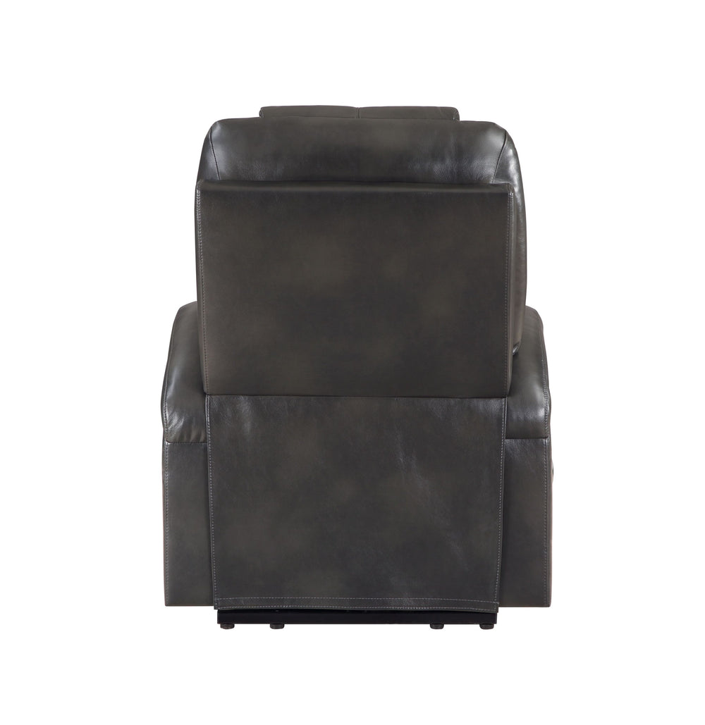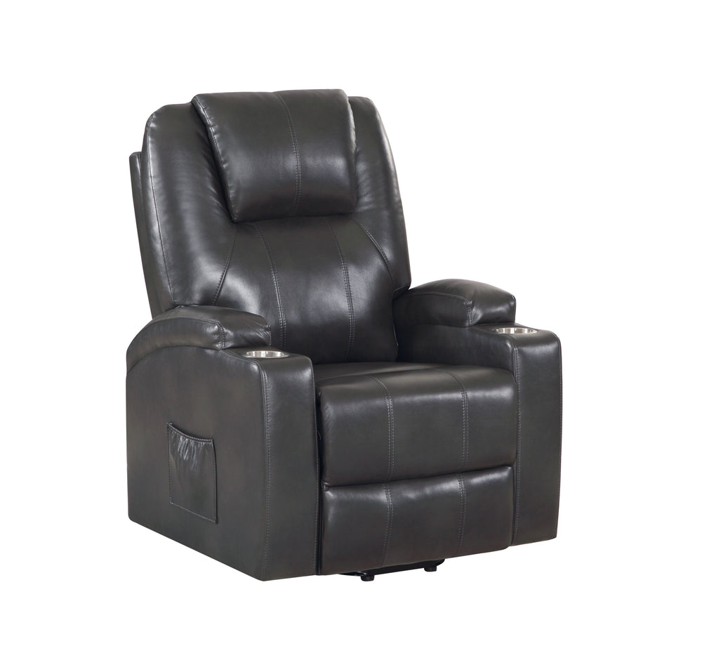 Enhance your living space with this power lift recliner, crafted for ultimate relaxation and convenience. Upholstered in durable gunmetal grey faux leather, it offers soft pillow top arms and a structured tight back for tailored support. The seat features pocket coils and a sturdy wooden frame to ensure long-lasting comfort and resilience. With a smooth power-remote recline and push-button lift system, effortless seating and standing are just a touch away. Two built-in cup holders add practical convenience, perfect for keeping your favorite beverages close during movie nights or relaxing afternoons. Compact yet ample in size at 42 inches high, 32 inches wide, and 37 inches deep, this recliner fits seamlessly into your primary living area. Elevate your comfort and make every moment relaxing — take control with the Gunmetal Power Lift Recliner today.