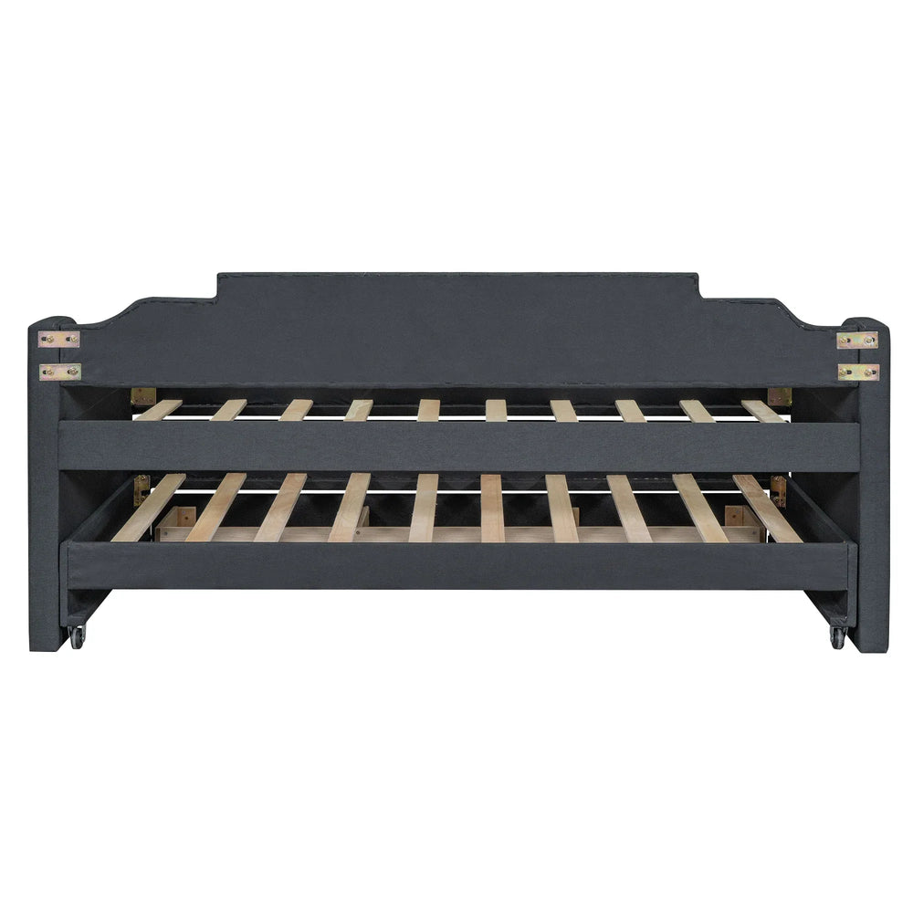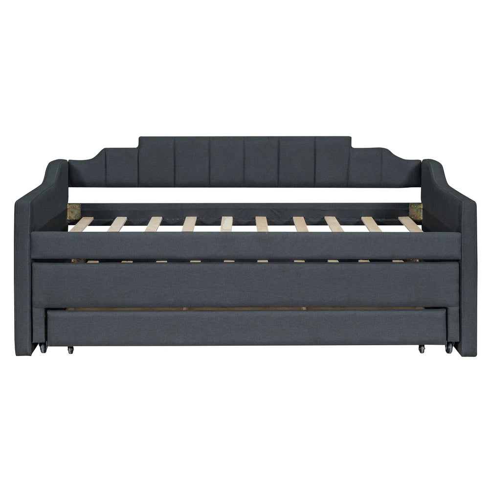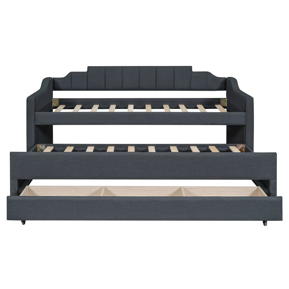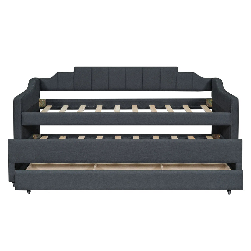 This versatile twin daybed expertly blends modern style with practical function, making it the ideal choice for compact living spaces, guest rooms, or home offices. Upholstered in soft, durable grey linen-blend fabric, it provides a cozy seating area by day and a comfortable sleeping surface by night without the need for a box spring. Crafted from sturdy pine wood and MDF, its solid construction ensures lasting support and stability. The convenient trundle smoothly rolls out to accommodate overnight guests, while three built-in drawers offer ample storage for linens, games, or personal items, helping you keep your space organized. With sleek rails on both sides, this daybed effortlessly transforms from sofa to bed, adding flexibility and charm to your room. Easy to assemble with included tools and instructions, it’s the perfect blend of comfort, storage, and multi-functional design. Elevate your living space today with this practical twin upholstered daybed.