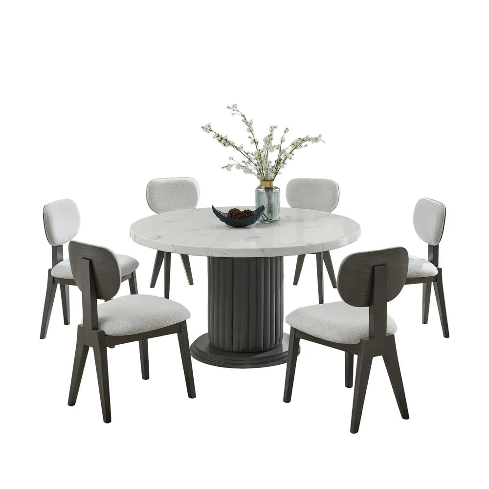 Bring modern sophistication and comfort to your dining room with the Valencia 7-piece dining set. Featuring a 54-inch round table topped with pristine white faux marble, this set offers a stunning centerpiece perfect for family meals and entertaining guests. The contemporary gray pedestal base combines wood construction with cushioned PVC upholstery and elegant fluted stitching to provide stability and style. Six light gray fabric chairs with curved upholstered backrests and foam padding ensure plush comfort for long conversations and dinners. Crafted from durable MDF, plywood, foam, and PVC, this dining set blends lasting quality with refined aesthetics. With ample seating for up to six, transform your space into a welcoming gathering spot. Elevate your dining ambiance today.