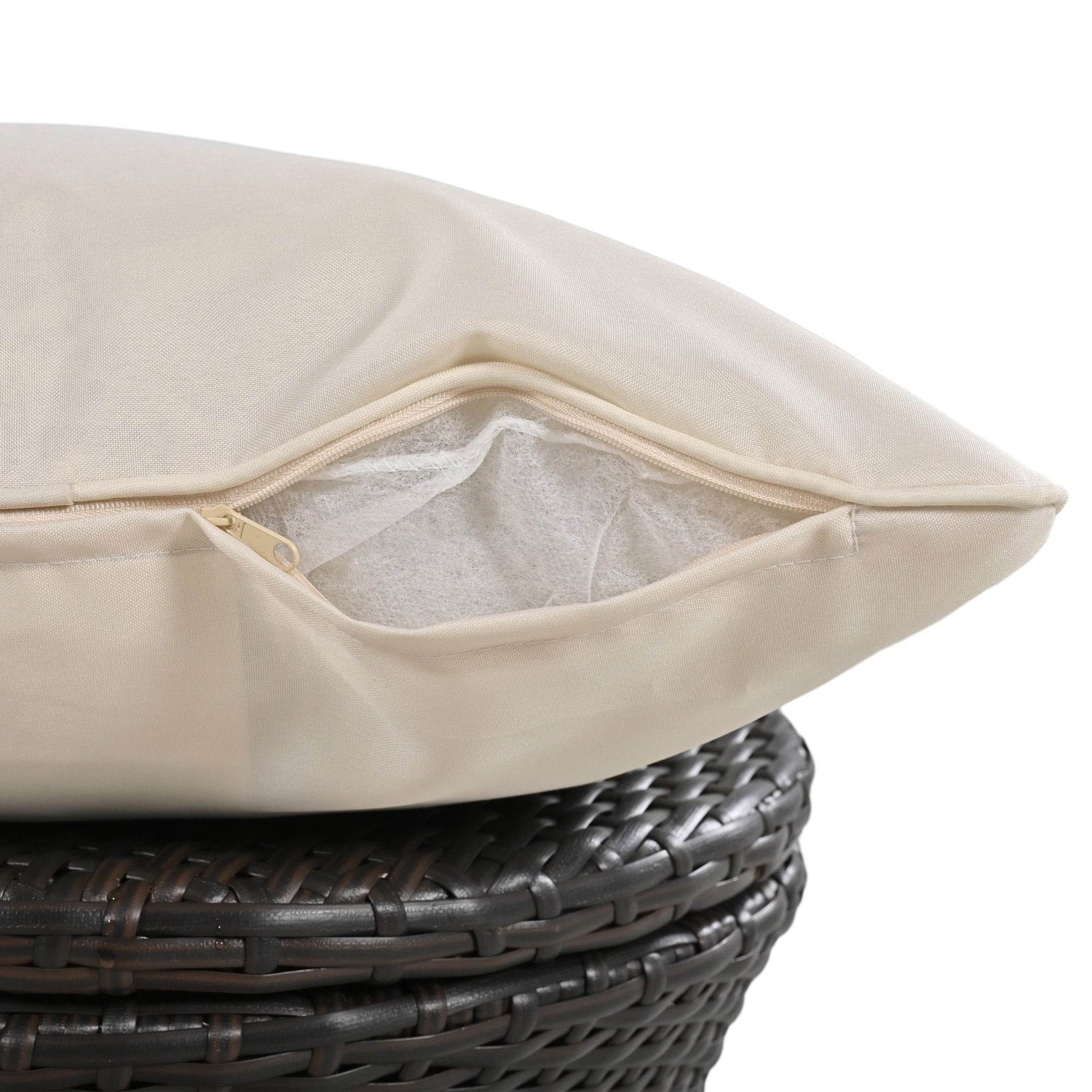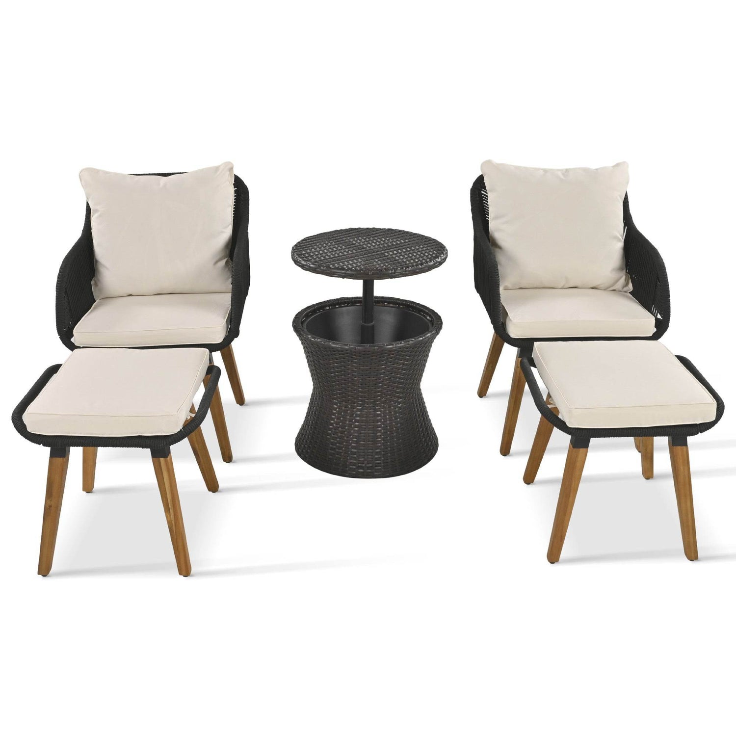 Refresh your backyard, porch, or poolside with this elegant 5-piece patio conversation set that blends modern boho charm with classic farmhouse style. Crafted with premium 5mm PP woven rope and a rust-resistant galvanized steel frame, each piece is built to endure harsh weather while maintaining its stunning look. The set includes two comfortable single chairs, two ottoman stools, and a versatile pop-up cool bar table featuring a hidden 4-gallon cooler perfect for keeping drinks chilled during warm days. Plush, fade-resistant cushions with water-repellent polyester covers provide superior comfort and easy cleaning with removable, washable designs. FSC-certified Acacia wood feet add natural beauty and reliability, enhancing stability and durability. Whether relaxing with guests or enjoying quiet moments, this set offers both style and function to transform your outdoor space. Elevate your relaxation today.