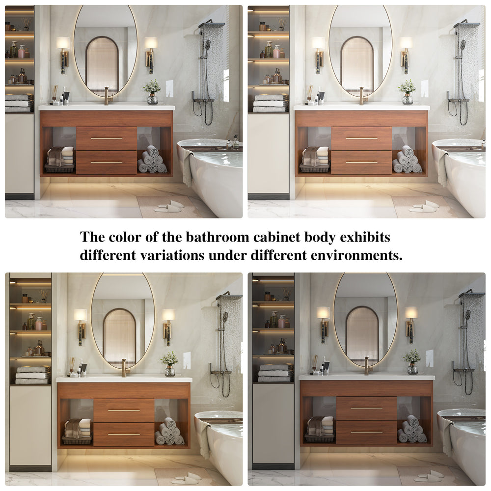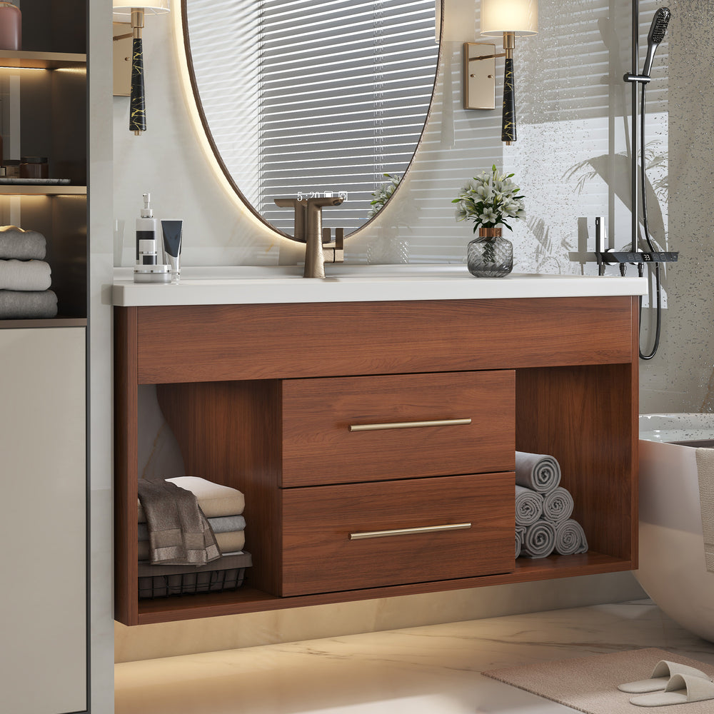 Modern bathroom vanity features an integrated ceramic undermount sink for hygienic, easy cleaning, durable moisture-resistant multilayer solid wood build, and flexible storage with soft-close drawers plus open shelves. Oil rubbed bronze handles complement farmhouse and mid-century styles, ideal for bathroom organization.