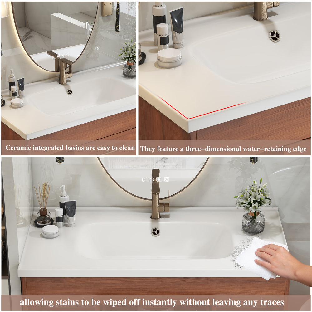Upgrade your bathroom with this elegant 35.4-inch vanity that combines mid-century modern charm with practical design. Crafted from durable, moisture-resistant multilayer solid wood, it offers lasting beauty and resilience in humid bathroom environments. The integrated ceramic undermount sink features a seamless design that prevents dirt buildup and makes cleaning effortless, maintaining a pristine look. With two soft-close drawers and two open shelves, this vanity provides versatile storage solutions to keep essentials organized and accessible. Accented by sophisticated oil-rubbed bronze handles, it blends classic warmth with modern style to enhance any bathroom décor. A perfect balance of function and elegance, this vanity will transform your space and simplify your daily routine. Elevate your bathroom today.