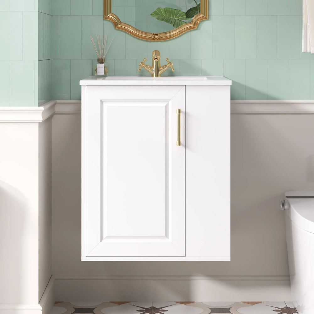 Upgrade your bathroom with this sleek wall-mounted cabinet featuring a white finish and a durable ceramic basin sink. Crafted from solid wood and MDF, this modern vanity offers a perfect combination of style and practicality. Its compact 20.3" length, 24" height, and 18.5" width (51.5 x 61 x 47 cm) save valuable floor space, while the floating design enhances room openness and simplifies cleaning. Keep your essentials organized with a spacious closed cabinet and an open side shelf that includes a convenient toilet paper holder. Designed to fit a standard 1.37" centerset faucet (faucet not included), this bathroom vanity blends seamlessly into contemporary interiors. Resistant to humidity and water damage, this cabinet provides lasting durability and easy maintenance. Elevate your bathroom’s functionality and style today with this versatile wall-mounted vanity.