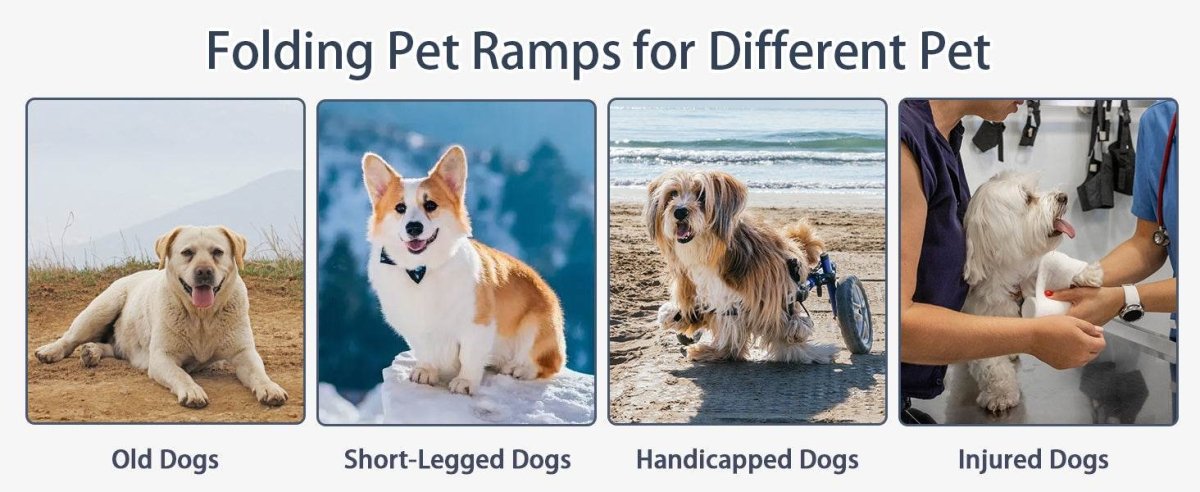Make getting in and out of cars, SUVs, trucks, or onto beds effortless for your medium to large dog with this portable folding dog ramp. Designed to reduce joint strain and prevent injury, it features a sturdy aluminum alloy frame and a non-slip carpet surface that keeps your pet safe and secure on every step. The extra-wide 17.5-inch (44.5 cm) steps offer stable footing for pets up to 250 pounds (113 kg). When travel calls, simply fold the ramp into four compact layers with an integrated handle for easy transport and storage. This ramp is a must-have for pet owners who want to support their dog's mobility and comfort every day. Elevate your pet’s independence and safety today.