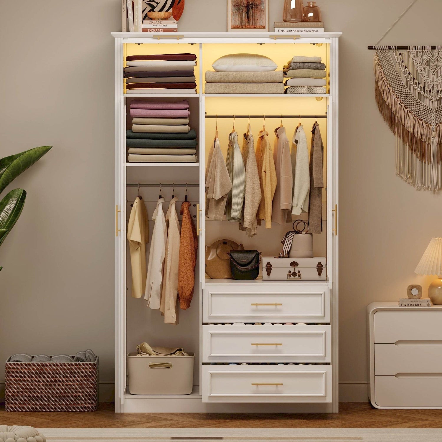 4 Door Wardrobe Armoire Closet features built-in LED lights for easy access in low light, versatile storage with 3 drawers, 2 hanging spaces, and a cabinet, crafted from solid wood and MDF with elegant white and gold accents, ideal for organized bedrooms.