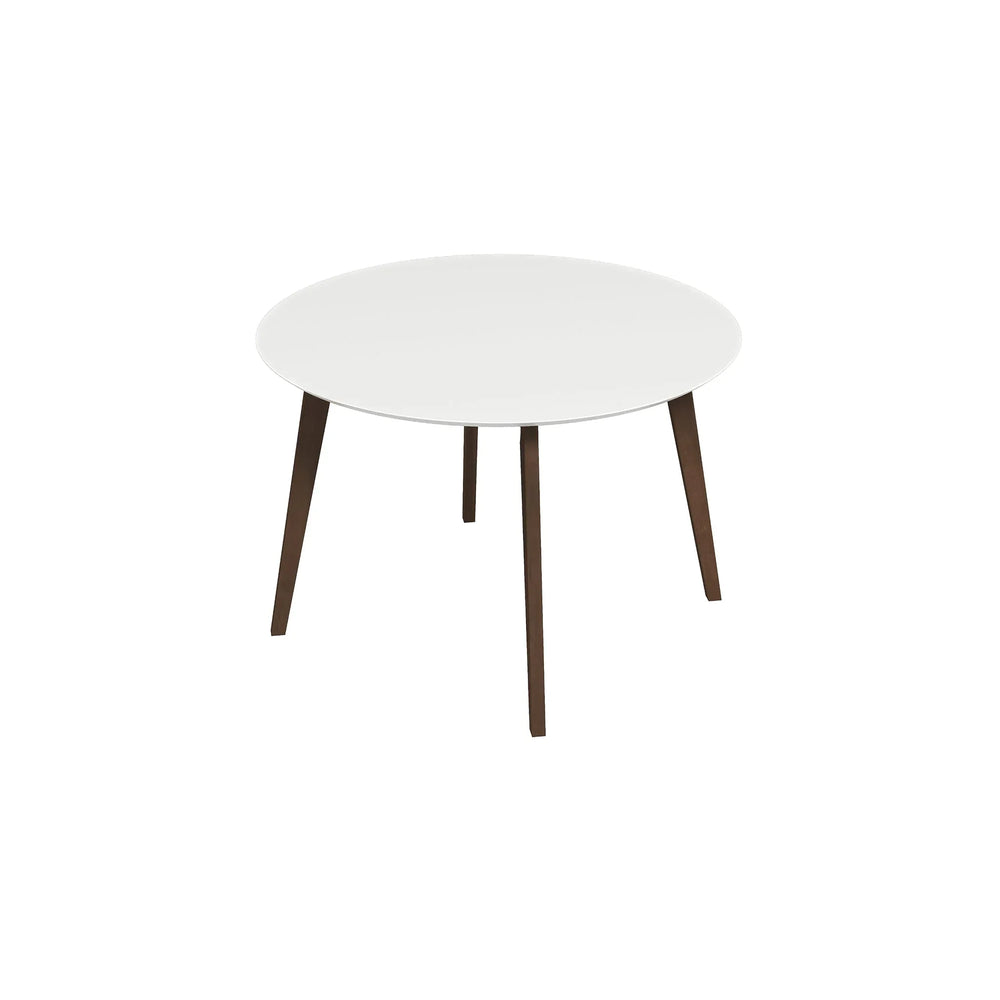 Alina Dining Table and chairs feature a solid wood base with a dark walnut stain and a smooth white top for easy cleaning. The kiln-dried wood construction ensures durability and minimal assembly, adding mid-century modern style and sophistication to dining or living spaces.