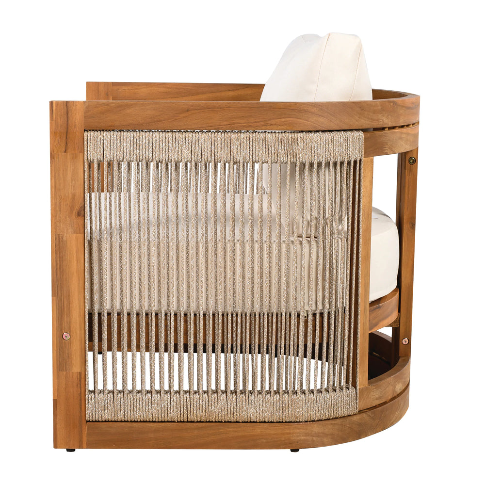 Omega Lifestyles outdoor club chair features premium acacia wood construction with natural weather resistance, a curvaceous tub design with woven rope accents for ergonomic support, elegant slat detailing, and water-resistant cushions ideal for stylish, comfortable patio relaxation.