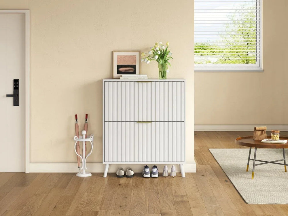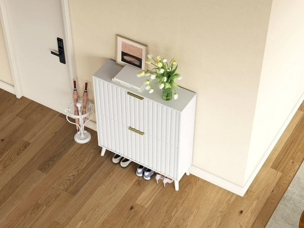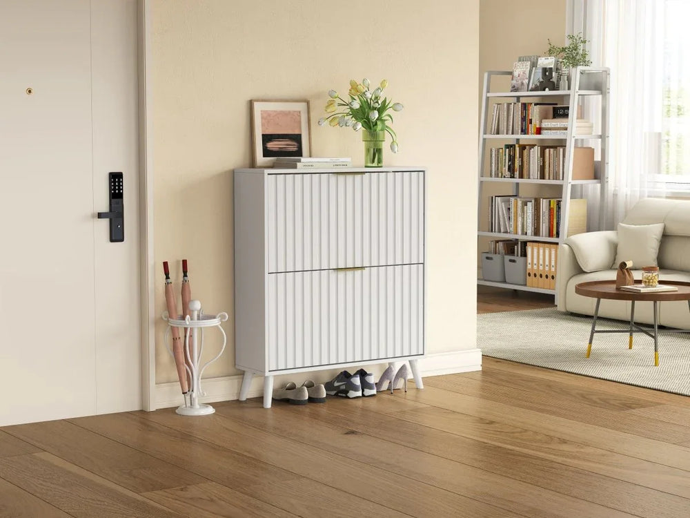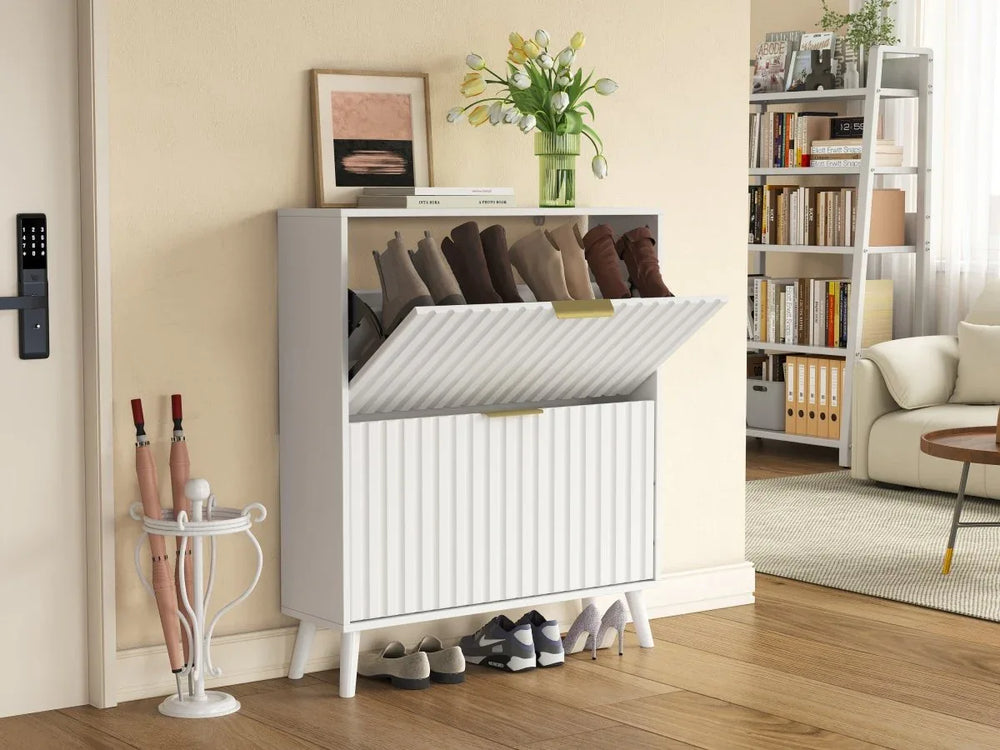 Organize your home effortlessly with this space-saving tipping bucket storage organizer, designed to combine style and functionality. Its narrow, sleek profile makes it perfect for small apartments or rooms where space is limited, while providing ample storage capacity with easy-access flip-down compartments. Crafted from high-quality particle board and MDF, supported by solid wood legs, this organizer offers durability and stability for long-term use. The intricately carved ancient white finish adds a refined touch, blending seamlessly with various decor styles. Thoughtful features like quiet cushioning during opening and a safety anti-tip kit ensure an enjoyable and secure storage experience. Use the top surface to display your favorite decor or keep essentials within reach. Elevate your home organization today with this versatile and elegant solution.