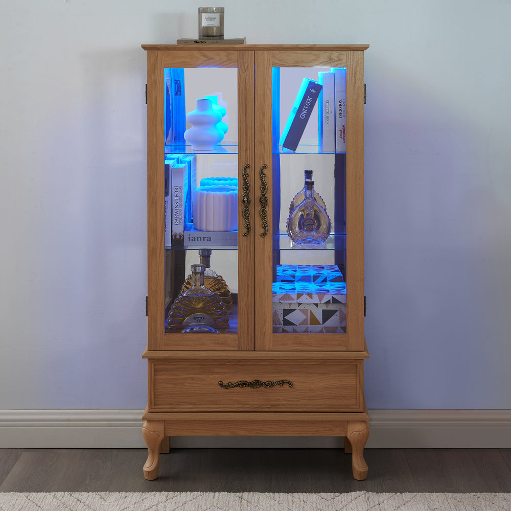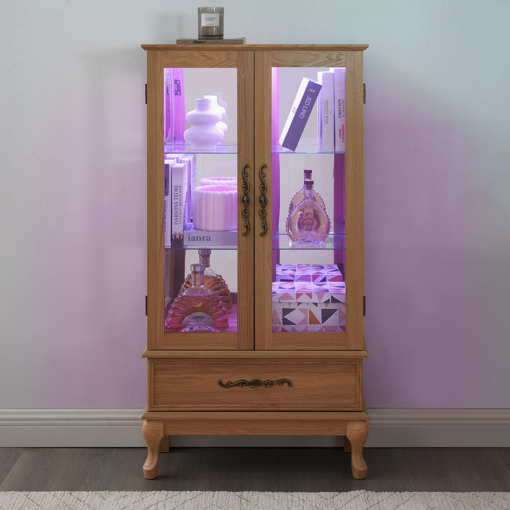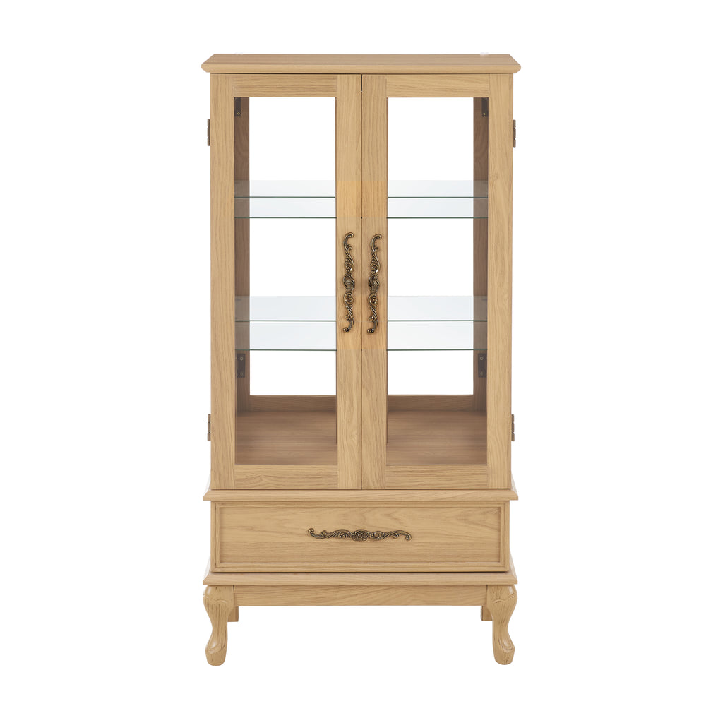 Lighted Glass Curio Display Cabinet features elegant light oak MDF and glass construction with vintage carved metal handles, adjustable tempered glass shelves, a hidden drawer, and integrated lighting to showcase collectibles while offering versatile storage and sophisticated home decor.