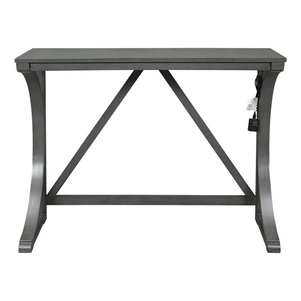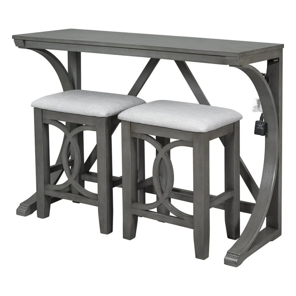 Bring timeless farmhouse charm to your dining room with this stylish 3-piece counter height dining set, featuring a rectangular solid rubberwood table and two upholstered stools in elegant gray. Crafted from durable solid wood and MDF, the set is built to last while adding warmth and character to compact spaces like apartments or studios. The stools boast plush 2-inch (5 cm) foam cushions wrapped in soft linen fabric for comfortable seating. Designed with modern convenience, the built-in USB and Type-C ports keep your devices powered while you work or relax by the table. Its space-saving design lets you tuck stools neatly underneath when not in use, maximizing your room’s efficiency. Easy to assemble with all tools included, this set seamlessly merges function and farmhouse style. Elevate your dining space today with this perfect blend of rustic appeal and modern utility.