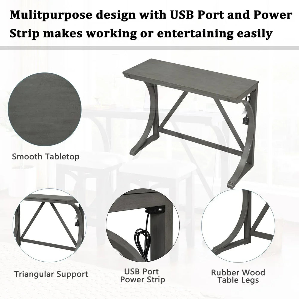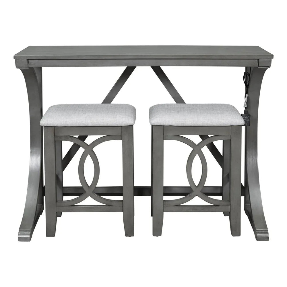Farmhouse-style rustic dining set made of solid rubberwood with upholstered foam stools, featuring built-in USB and Type-C ports for device charging. Compact counter height design seats two, ideal for small dining rooms and apartments, with easy assembly and classic gray finish.