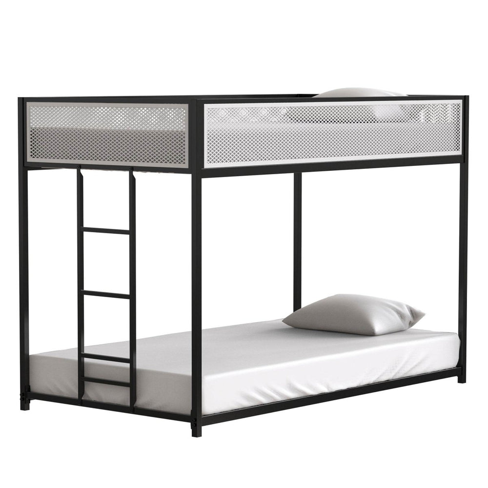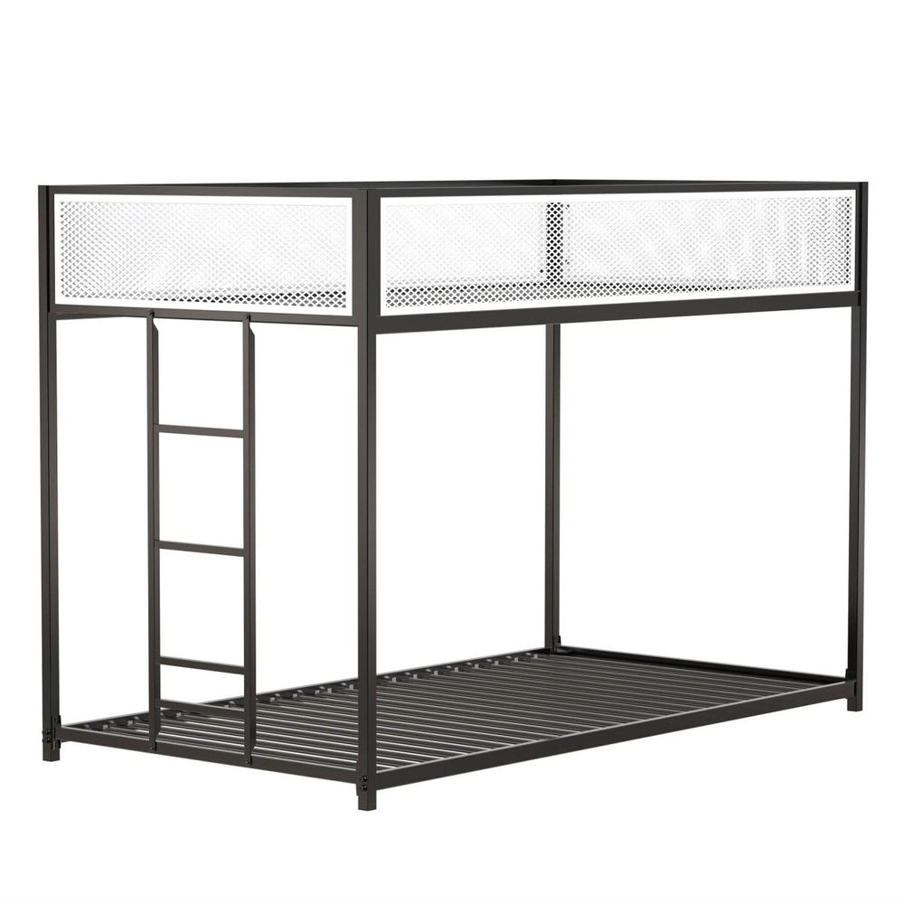 Designed for kids, teens, and adults, this twin over twin bunk bed combines durable metal construction with practical features to optimize your bedroom space. The sleek black and white two-tone finish and metal mesh panel guardrails blend modern aesthetics with sturdy safety. Built with a reinforced square tube frame, it supports up to 350 lbs on the top bunk and 400 lbs on the lower bunk, ensuring solid stability for a restful night's sleep. The low-profile design keeps the top bunk closer to the floor for added safety, while the integrated ladder with wide steps offers easy climbing. No box spring is needed thanks to the strong metal slats that prevent mattress sagging. Ideal for bedrooms, dorms, or guest rooms, this bunk bed is as versatile as it is reliable. Elevate your bedroom setup today with this functional, stylish bunk bed that encourages fun and comfort for all ages.