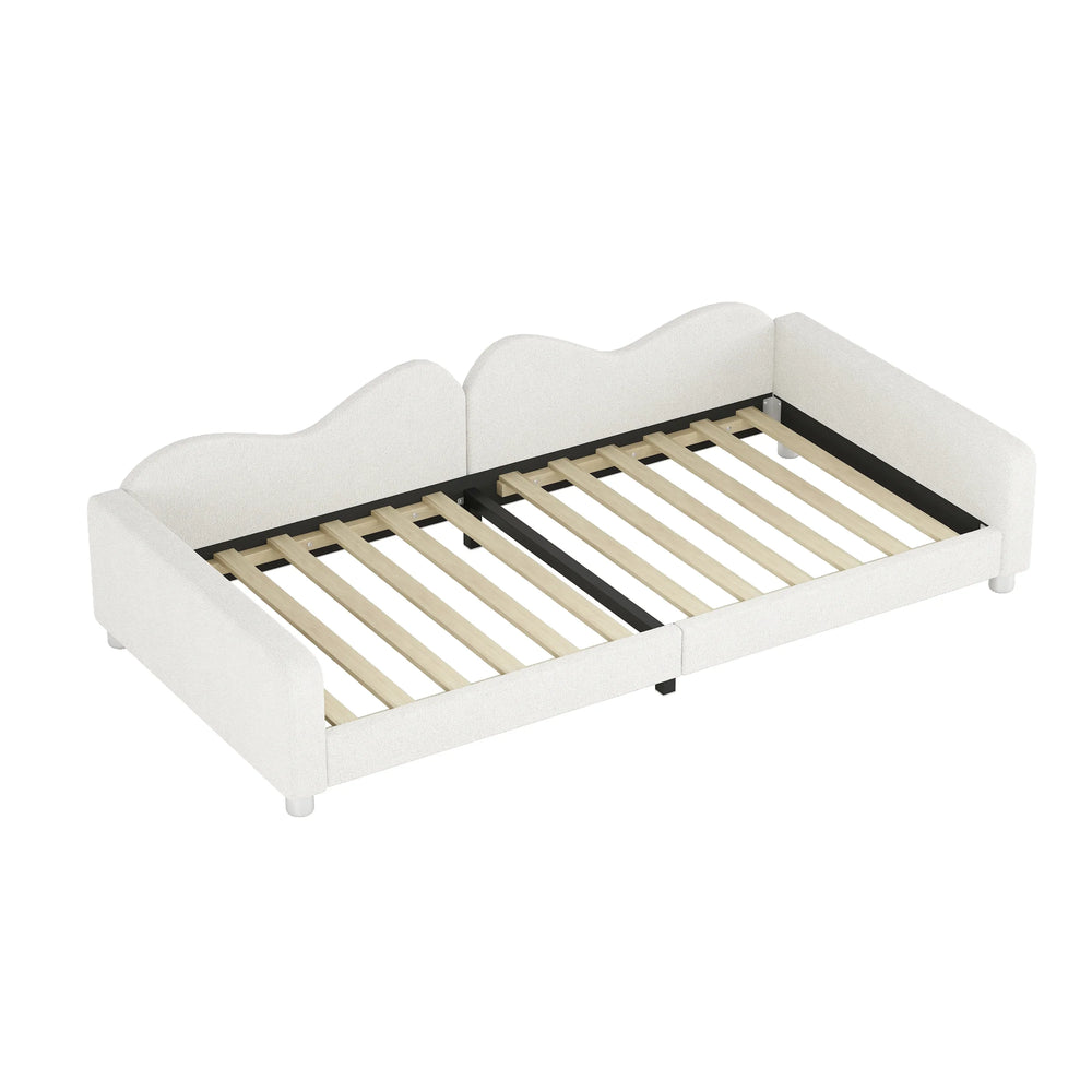 Bring warmth and style to any room with this twin-sized upholstered daybed featuring soft, selected sherpa fabric that delivers a cozy and inviting feel. The charming cloud-shaped backrest and cushioned armrests provide both comfort and a playful design element loved by kids and adults alike. Crafted with a durable MDF and plywood frame, this daybed offers exceptional stability and support with 12 slats designed to carry up to 330 lbs, eliminating the need for a box spring. Measuring 80 inches long, 42 inches wide, and 27 inches high, it fits perfectly with standard twin mattresses up to 6 inches thick. Whether used as a sofa or bed, this daybed blends relaxation and functionality effortlessly. Elevate your space and enjoy versatile comfort today.