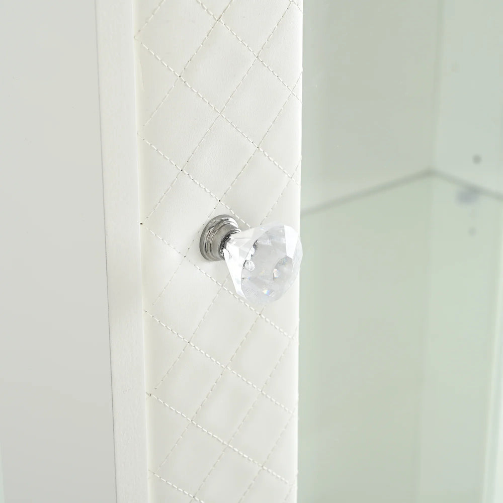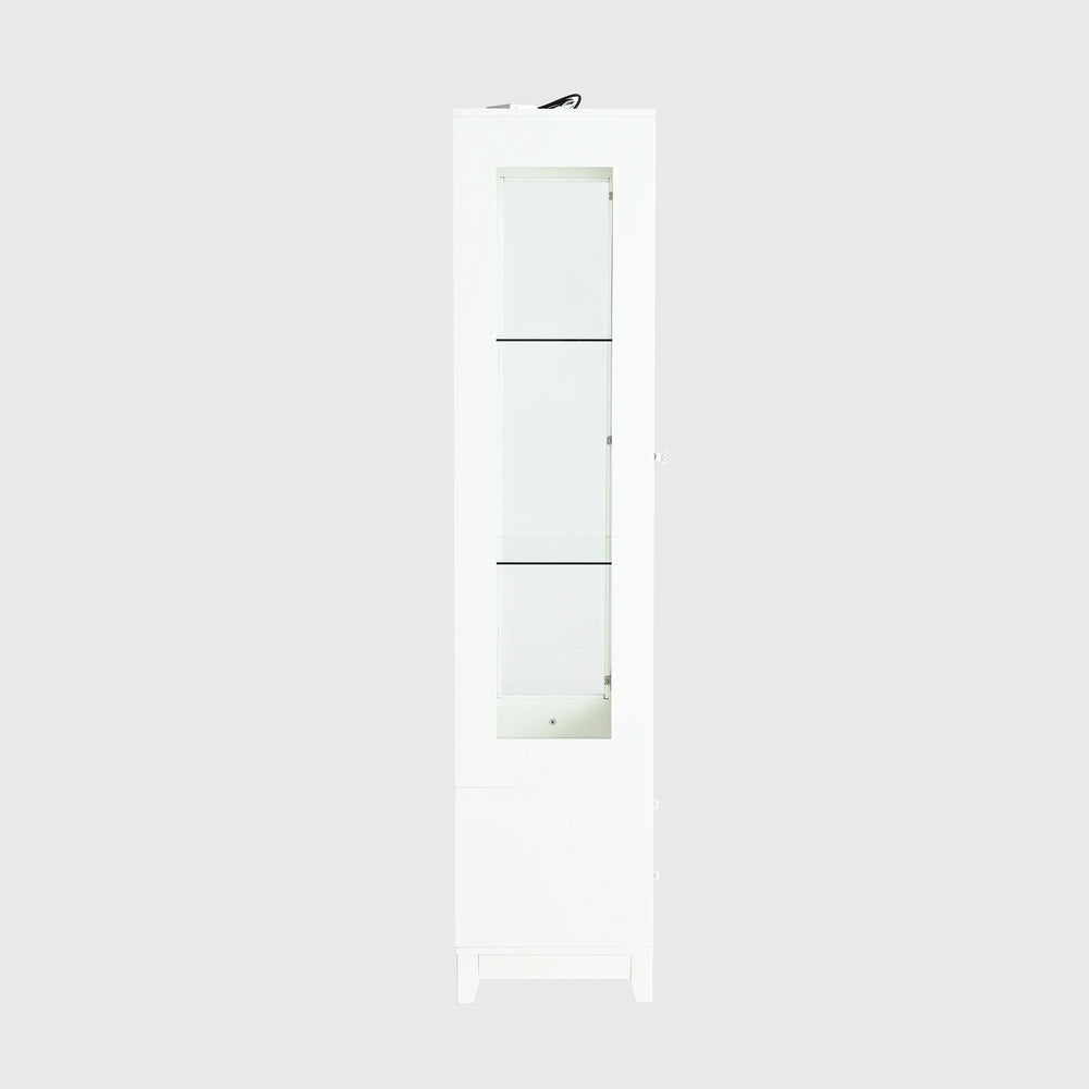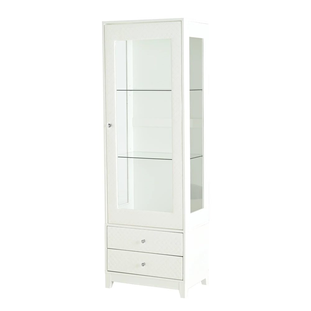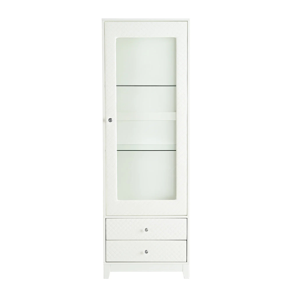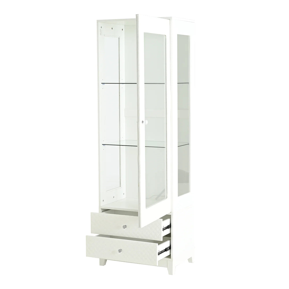 Elevate your living space with this stylish 71-inch tall display cabinet, designed to blend modern elegance with functional storage. Featuring a unique diamond-patterned upholstered soft-touch door and drawer fronts, the cabinet adds warmth and sophistication while protecting your prized items. The three-sided tempered glass panels offer a 180° panoramic view, beautifully showcasing collectibles, trophies, books, and more. Equipped with an ETL-certified adjustable 5-color LED ceiling light, it highlights your items with customizable brightness and color temperature from 2700K to 5000K. Crafted from durable, warp-resistant MDF with a smooth painted finish, this freestanding cabinet ensures lasting stability and timeless style. Adjustable tempered glass shelves and two spacious drawers provide flexible storage to suit your needs. Easy to assemble and maintain, this display cabinet enhances any room’s décor while keeping your valuables organized and dust-free. Elevate your home display today.