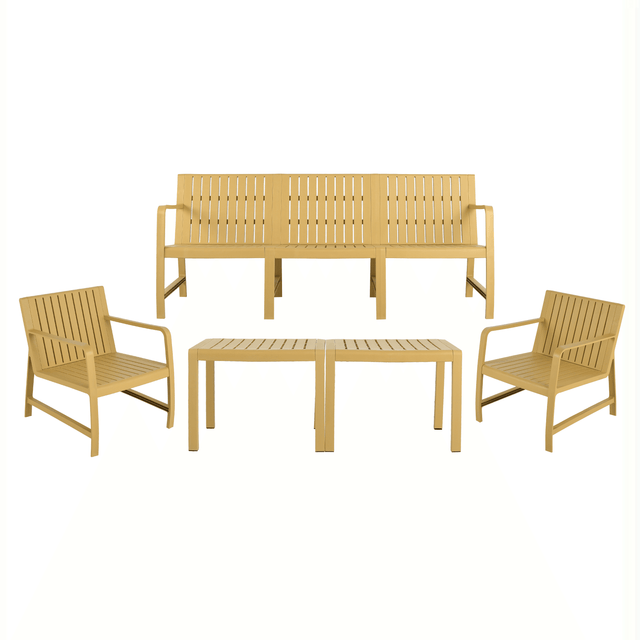 This 5-piece indoor/outdoor furniture set features durable polypropylene construction and a rust-resistant frame for all-weather use. Its ergonomic slatted design offers breathable comfort and deep seating, ideal for family gatherings, poolside lounging, or balcony relaxation.
