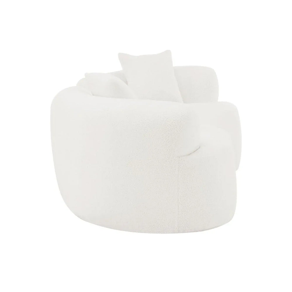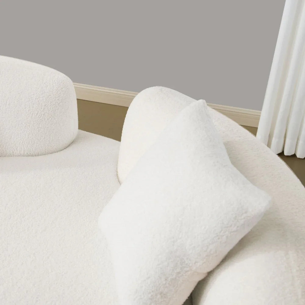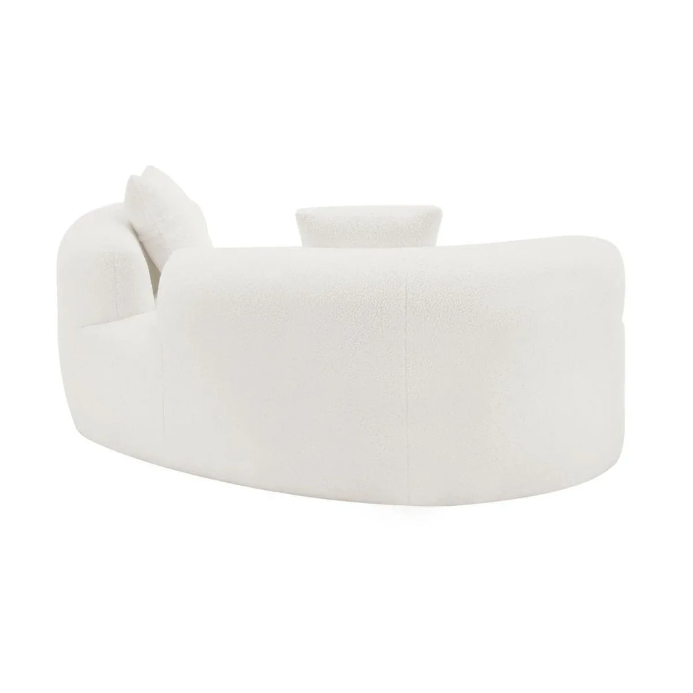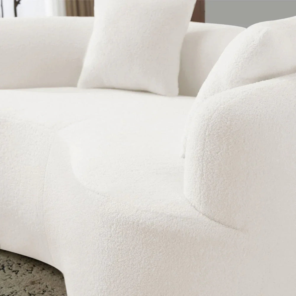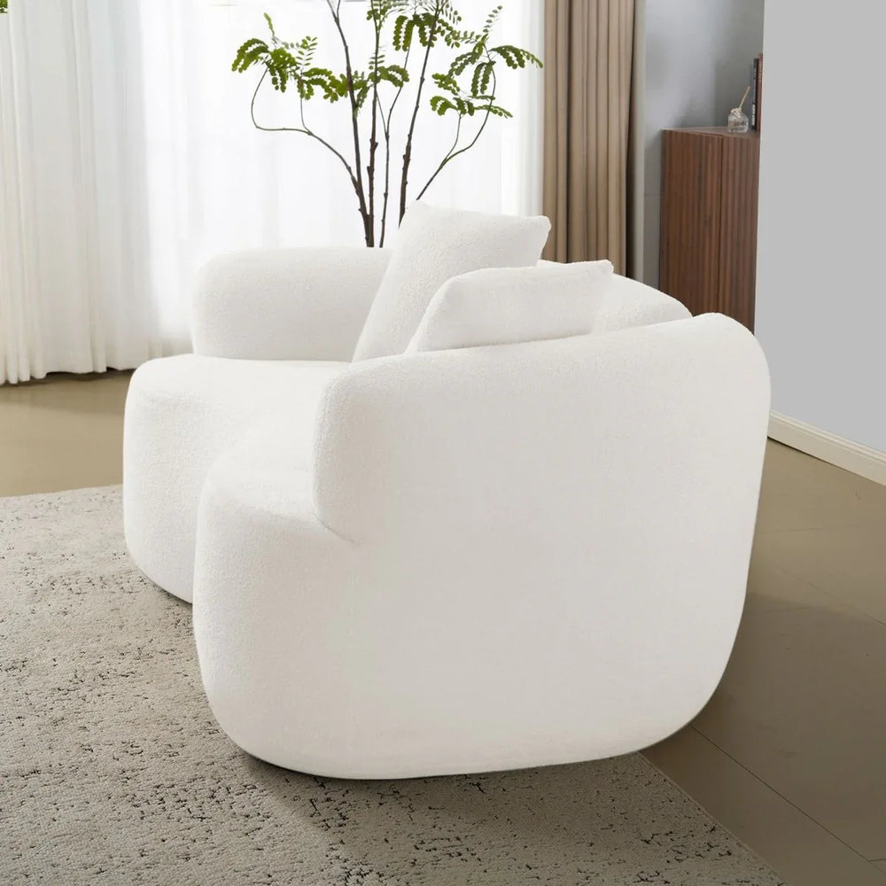 This minimalist white curved loveseat features high-density foam and spring cushioning for medium-firm comfort supporting up to 350 lbs. Crafted with durable, breathable teddy fabric, it’s ideal for primary living spaces, delivered fully assembled for easy setup and lasting relaxation.
