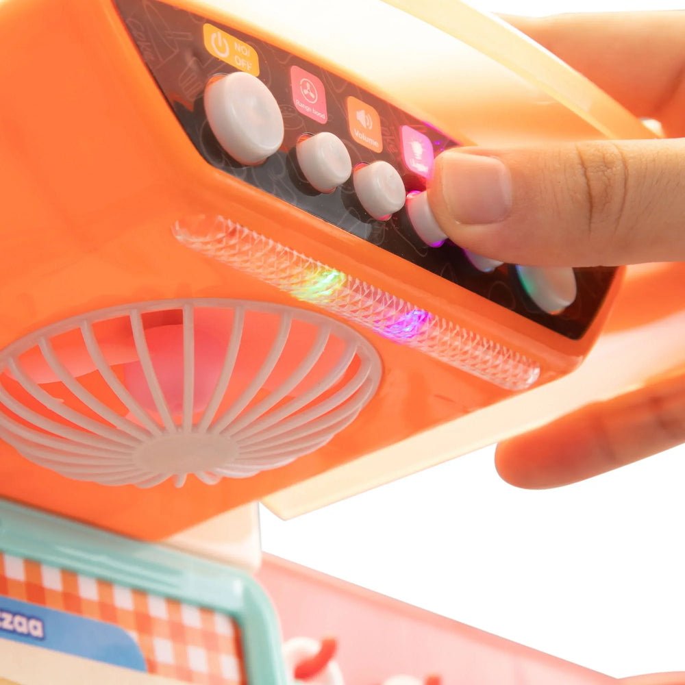 Omega Lifestyles Kids Kitchen Playset features 65 realistic accessories with sound, light, and smoke effects to enhance imaginative play. Made of durable, odorless polypropylene, it cultivates children's hands-on skills and social development in a safe, portable design.