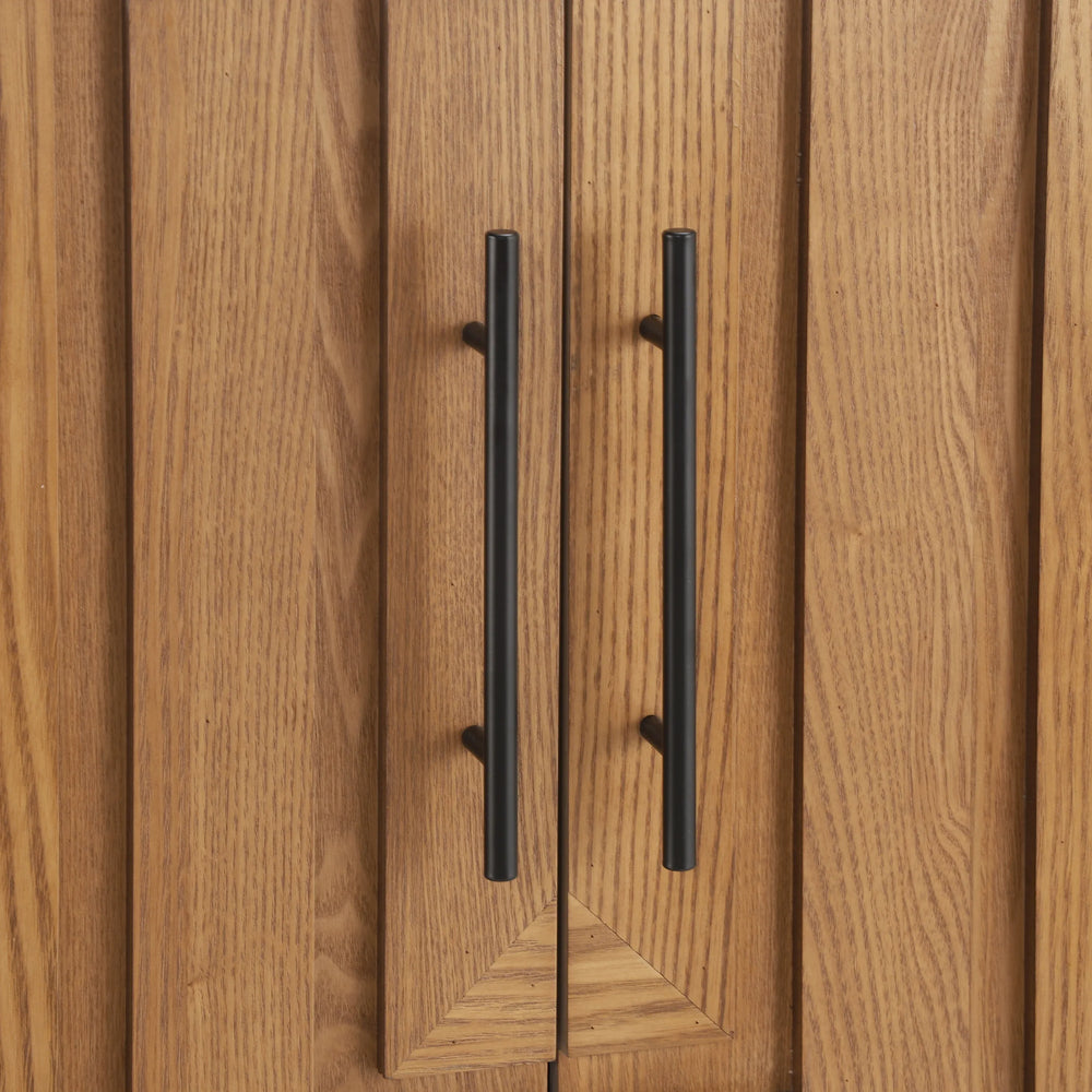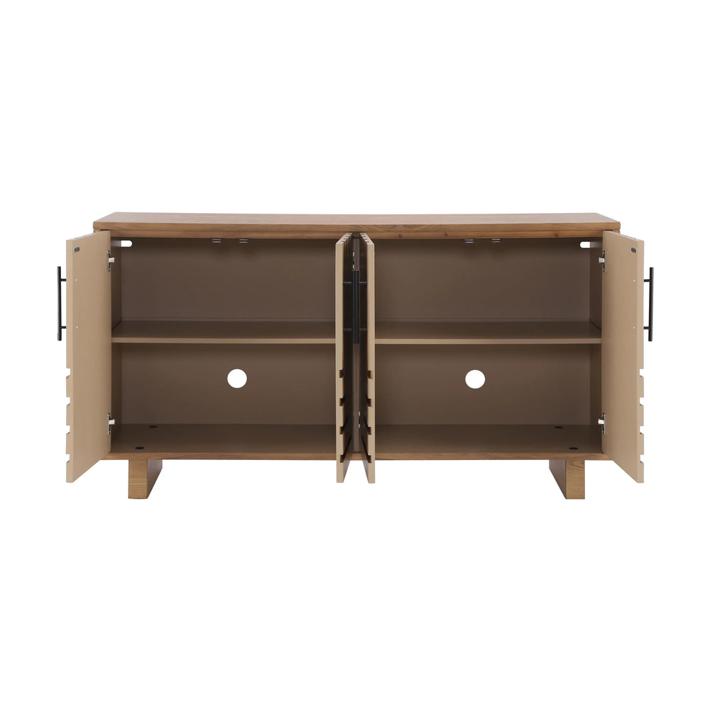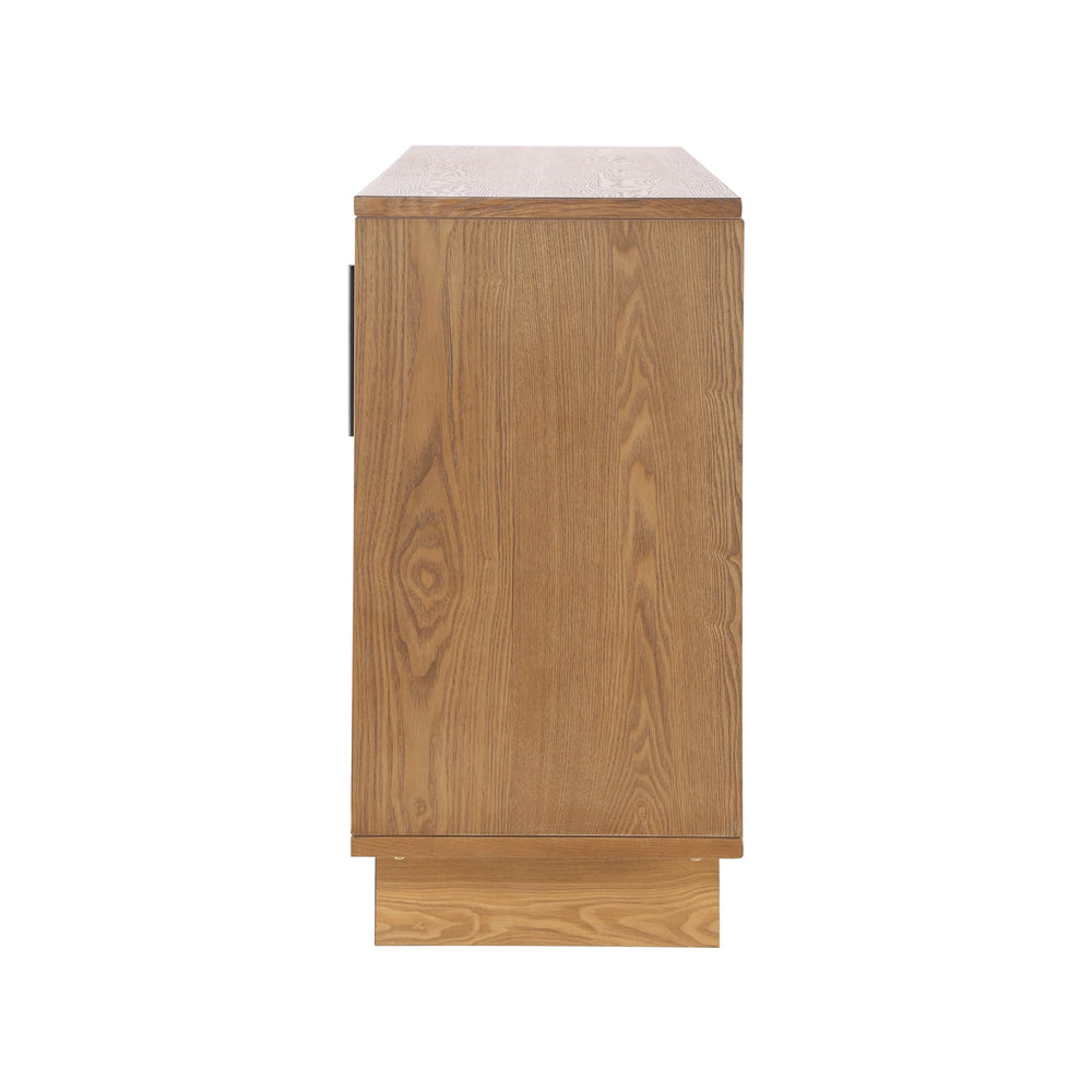 Modern sideboard cabinet features natural MDF and ash veneer with metal handles, offering spacious storage with four doors. Its sleek natural finish and geometric panels suit dining rooms or living areas, providing durable, versatile storage for everyday use.