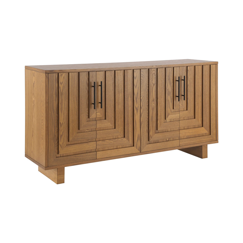 Maximize your dining or living space with this stylish modern sideboard, crafted to combine function and contemporary design. Measuring 59 inches long, 15.75 inches deep, and 32.5 inches high, it offers generous storage with four spacious doors to neatly organize dining essentials, décor, or everyday household items. Constructed from durable MDF and ash tree veneer, complemented by sturdy metal handles, this cabinet ensures lasting performance. Its clean natural finish and geometric panel detailing add a sleek, sophisticated look that enhances any room—from dining areas to entryways. Adult assembly is required, making it an ideal versatile storage piece for modern homes seeking both style and practicality. Elevate your organization and home décor today.