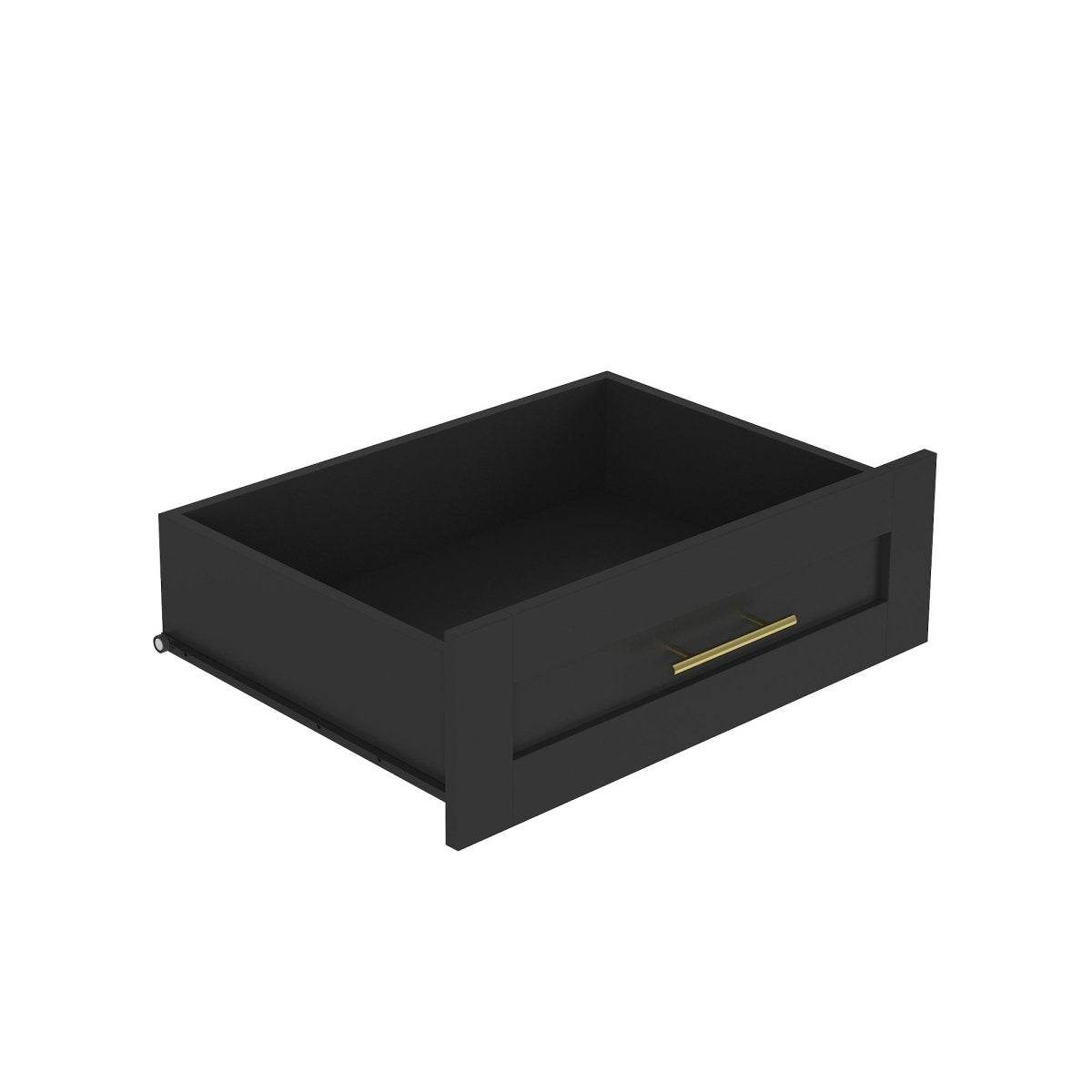 This black MDF wardrobe features a sturdy 18mm frame with sliding barn doors, four drawers, open shelves, and a hanging rod to organize coats and long garments, combining practical storage and classic style for bedroom use.