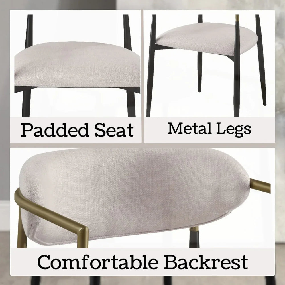 Combine style and comfort effortlessly with this elegant side chair set, featuring a beige linen upholstery that complements modern and classic interiors. The cushioned seat and backrest offer plush comfort supported by durable foam density D22/D25, perfect for long meals or extended work sessions. Crafted with a sturdy metal frame and synthetic wood elements, these chairs promise stability and longevity with a sleek black finish that adds visual contrast. The oval-shaped seat contours to your body, enhancing seating comfort, while the gold-accented armrests provide a touch of refined luxury. Measuring 23 inches wide and deep with a height of 31 inches, each chair supports up to 220 pounds of weight capacity. These versatile chairs are ideal for dining rooms, home offices, or seating nooks. Upgrade your space today with this stylish, durable, and comfortable seating solution.