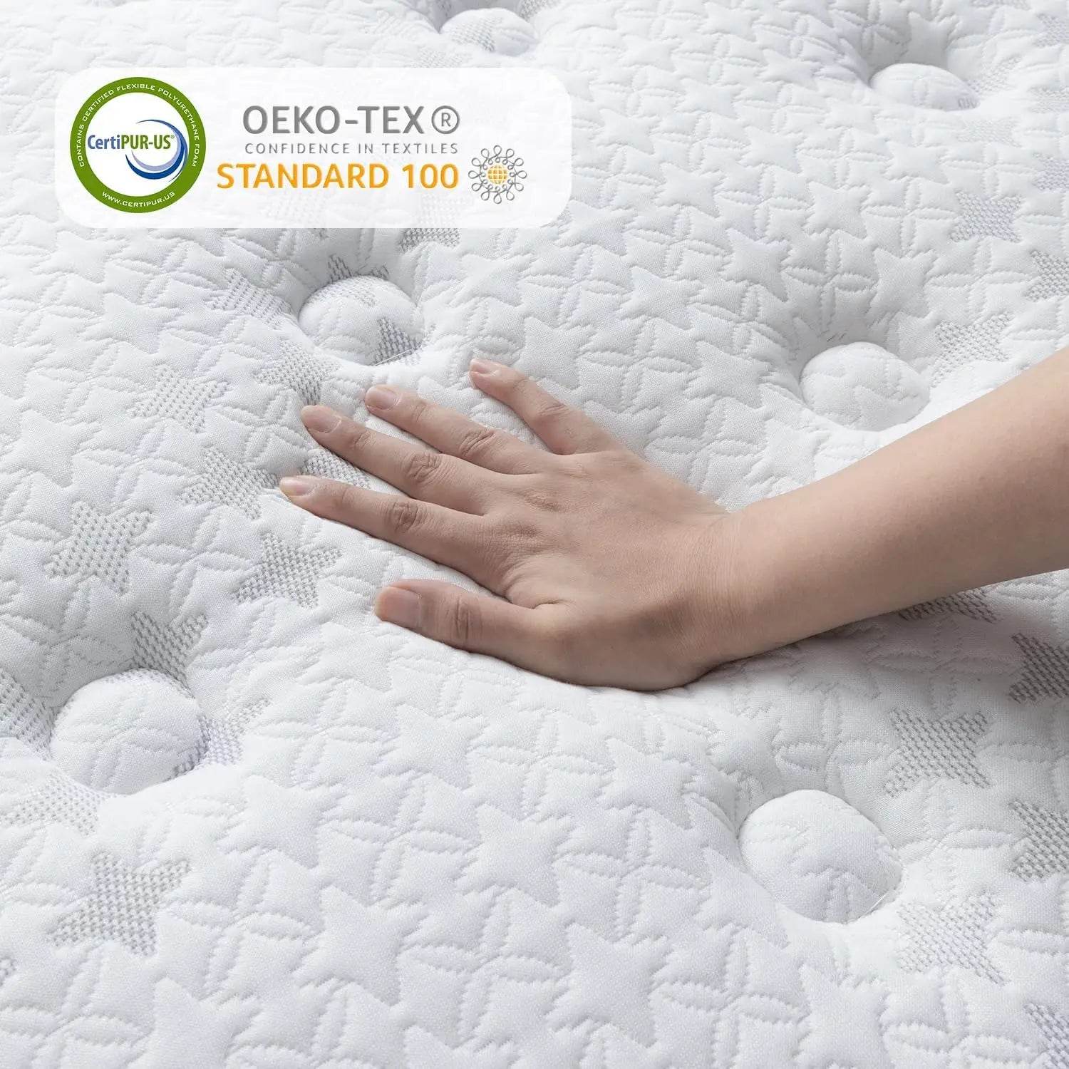 Enjoy restful nights on this premium hybrid mattress combining luxurious gel memory foam with individually pocketed springs for unparalleled comfort and support. The 12 to 14-inch thickness provides optimal cushioning that contours to your body, relieving pressure points and promoting proper spinal alignment. Advanced gel-infused foam promotes airflow to regulate temperature and keep you cool throughout the night. The pocket spring system minimizes motion transfer, allowing you and your partner to sleep undisturbed. Carefully quilted with breathable, skin-friendly fabric, this mattress ensures a safe, non-toxic sleep environment backed by CertiPUR-US and OEKO-TEX certifications. Proudly made in the USA with top-quality craftsmanship, it’s designed to enhance your bedroom with lasting durability and performance. Available in Full, Queen, and King sizes to suit your needs—upgrade your sleep setup today for rejuvenating rest every night.