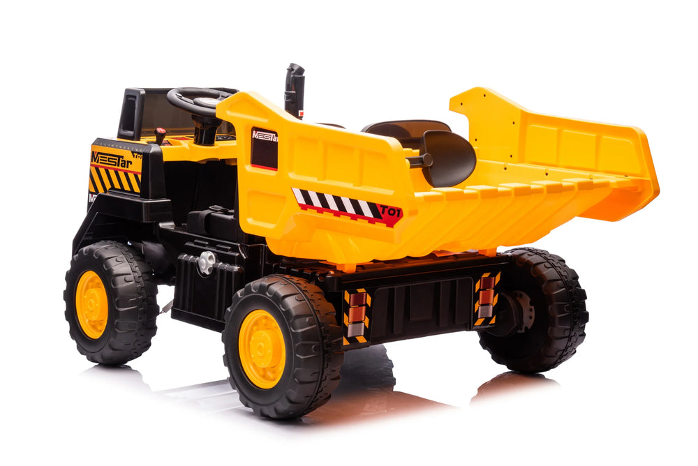 This yellow plastic 24V electric kid ride-on car features two driving modes with remote control, bright LED lights, an automatic lifting dump bucket, and durable wheels, offering safe, fun, and interactive play for children on various terrains.