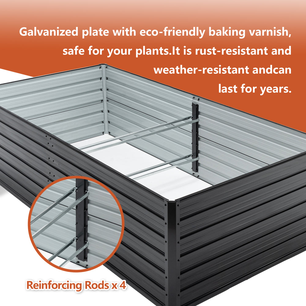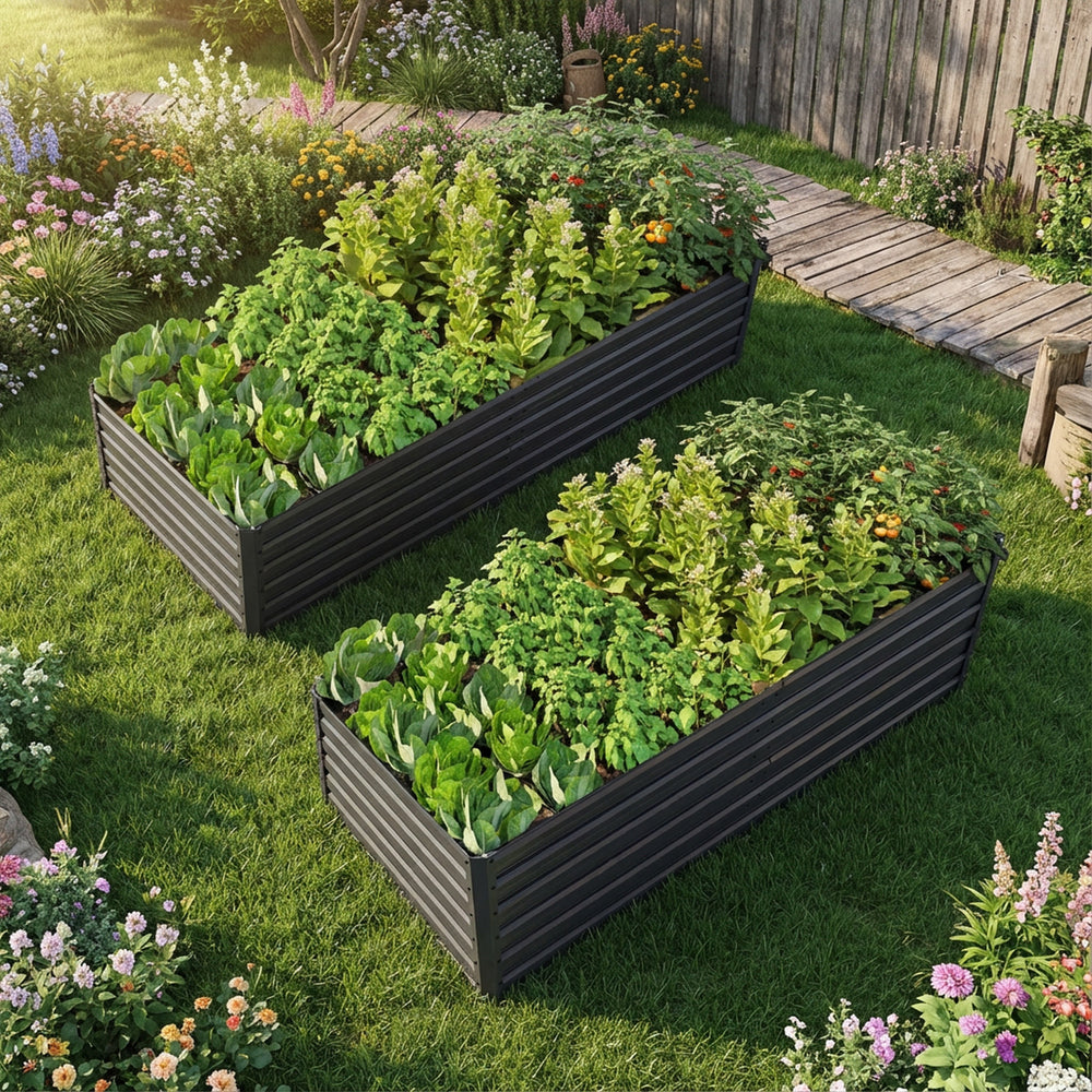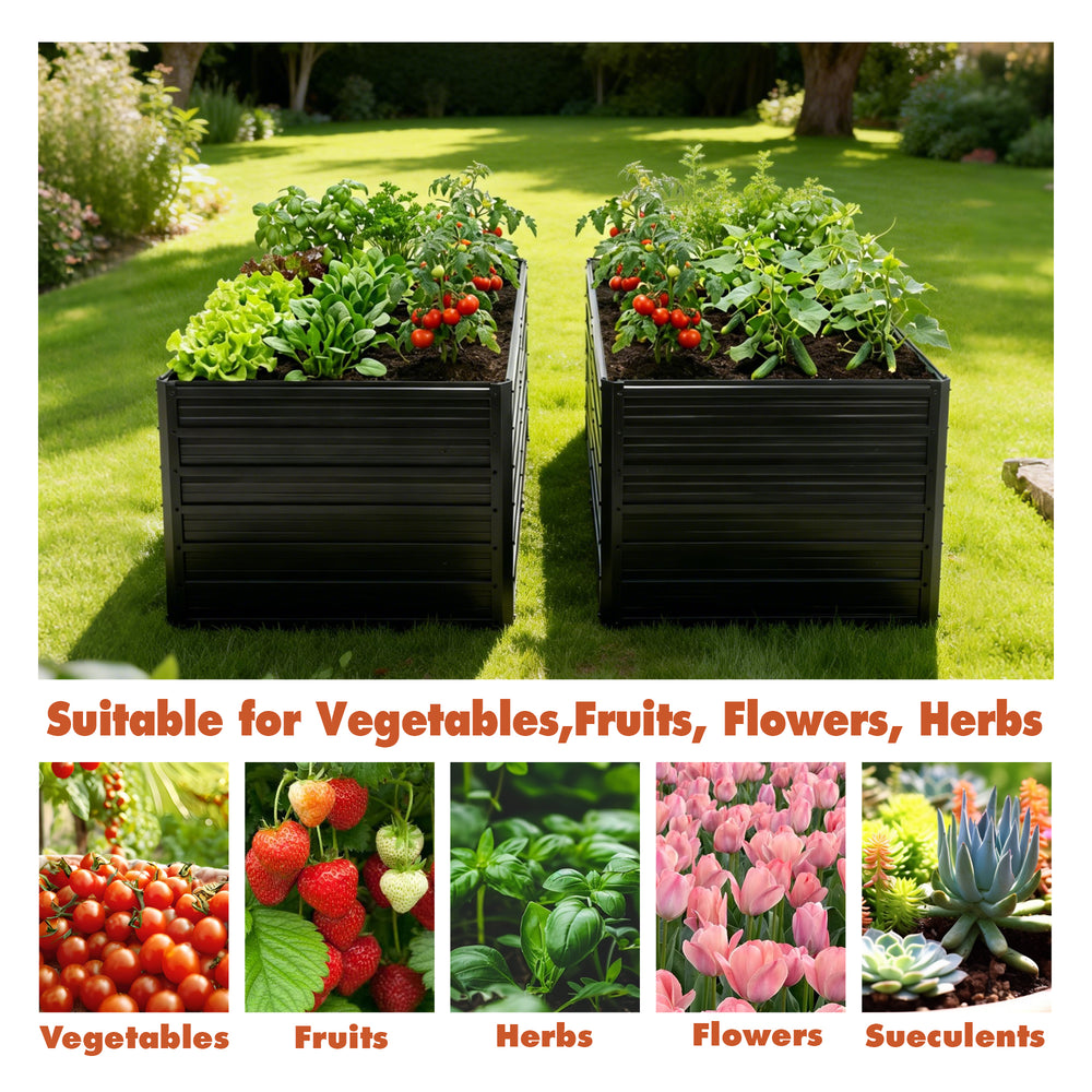 Elevate your outdoor gardening experience with this durable 2 pack raised garden bed set, each measuring 8 feet long, 4 feet wide, and 2 feet tall. Crafted from galvanized steel with an eco-friendly baked finish, these planter boxes resist rust and weather damage, providing a safe and sturdy foundation for your vegetables, herbs, and flowers. The open-base design promotes deep root growth and excellent drainage, helping your plants thrive by preventing waterlogging and root rot. Featuring reinforced bars for wind resistance and protective corner caps for safe handling, these beds combine functionality with a sleek black finish that complements any patio, balcony, or backyard garden. Assembly is straightforward and quick, so you can enjoy planting sooner. Transform your growing space and cultivate healthier, more vibrant plants with this practical and stylish raised garden bed kit. Start your gardening journey today and watch your garden flourish.