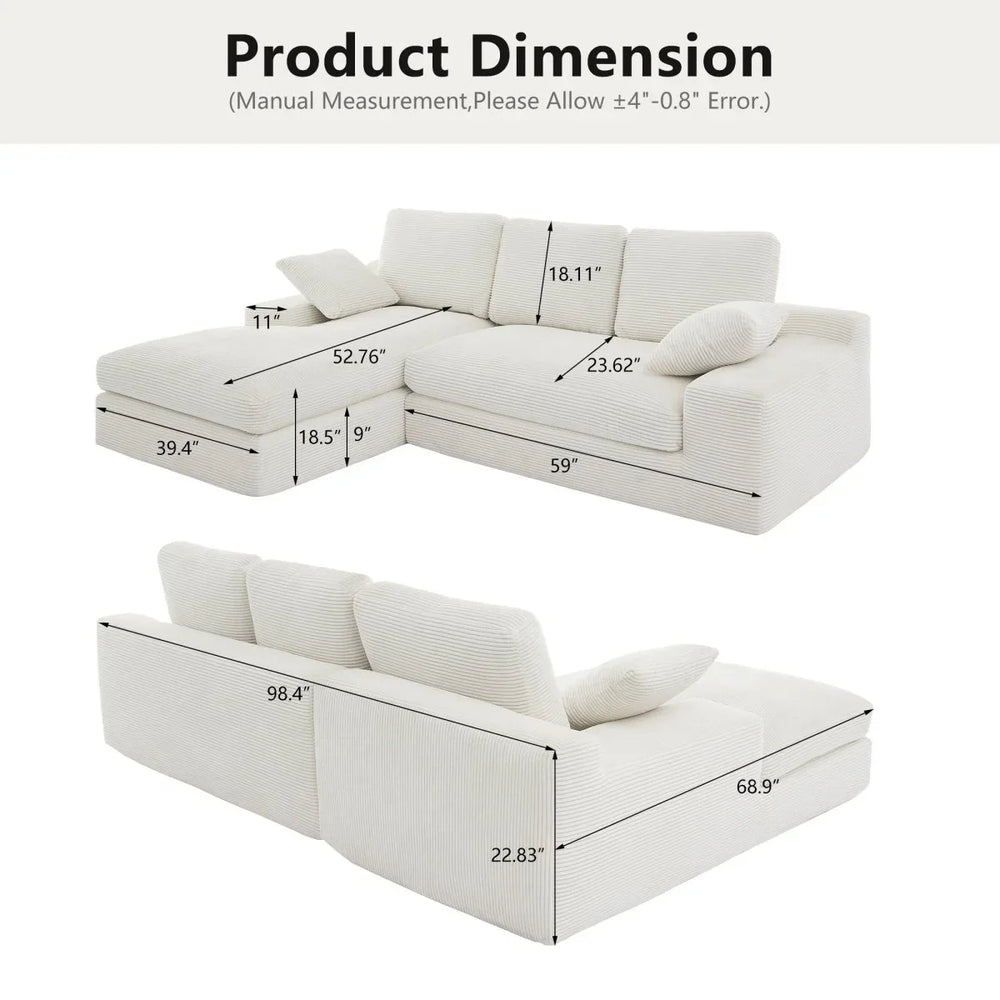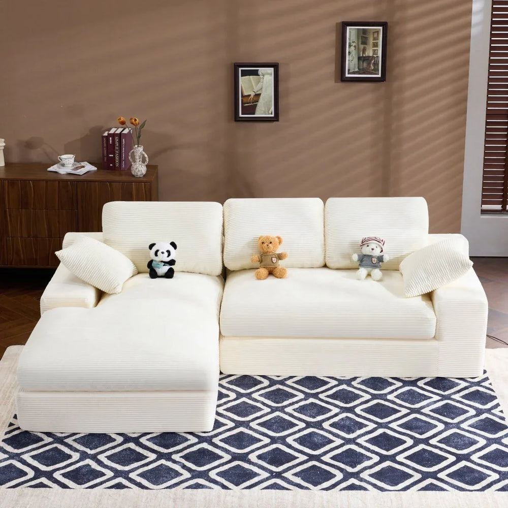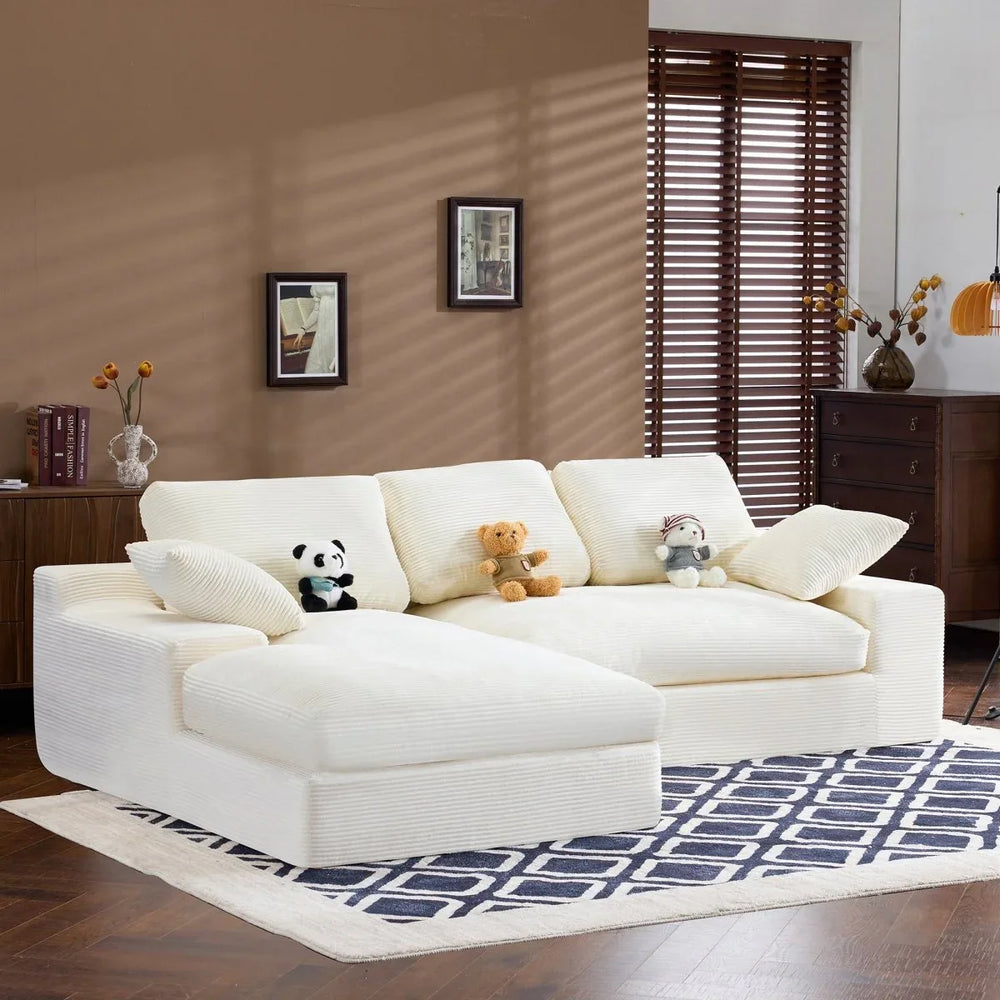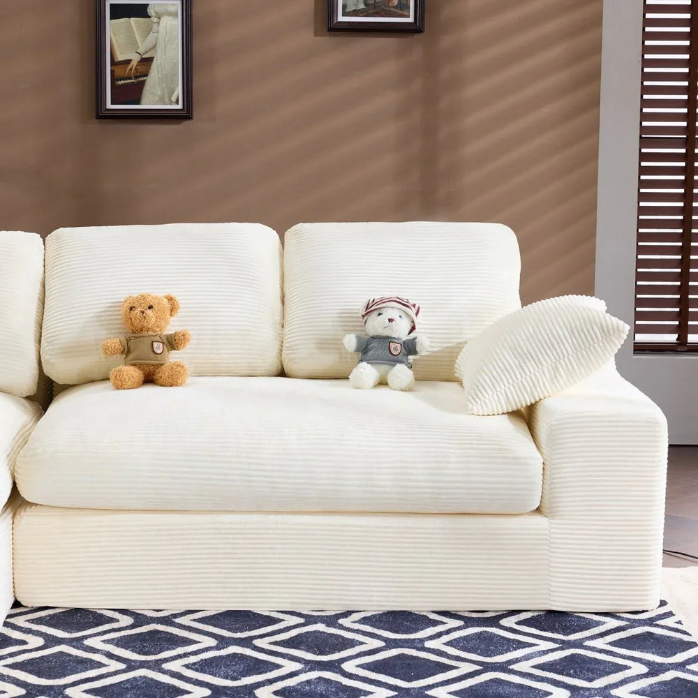 Bring warmth and softness to your living room with this white corduroy compressed sofa. Featuring a medium-soft foam seat and backrest, it delivers a gentle, skin-friendly feel that invites you to sit back and relax. The sofa’s compact yet spacious design accommodates up to four people comfortably, while the included three back cushions and two throw pillows enhance support and coziness. Its compressed construction makes moving and repositioning effortless, perfect for adapting your primary living space to your lifestyle. The durable foam filling resists sagging and deformation, ensuring long-lasting comfort and easy daily maintenance. Create a healing atmosphere and enjoy moments of relaxation with a sofa that blends simple style and practical function. Elevate your living area today.