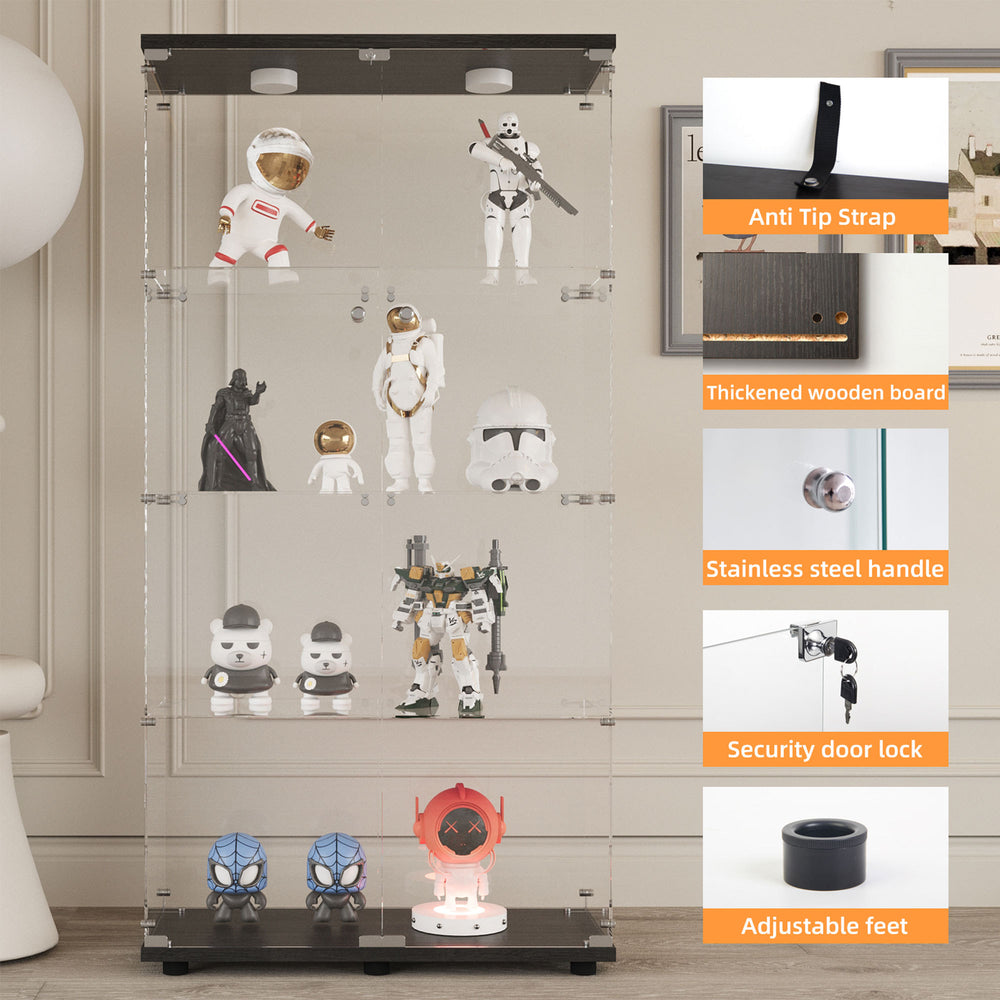 Classic tempered glass display cabinet features 3-4 shelves with built-in adjustable color lighting, door locks, and safety glass to minimize cuts. Equipped with locking casters and adjustable feet, it offers versatile storage and placement for primary living spaces.