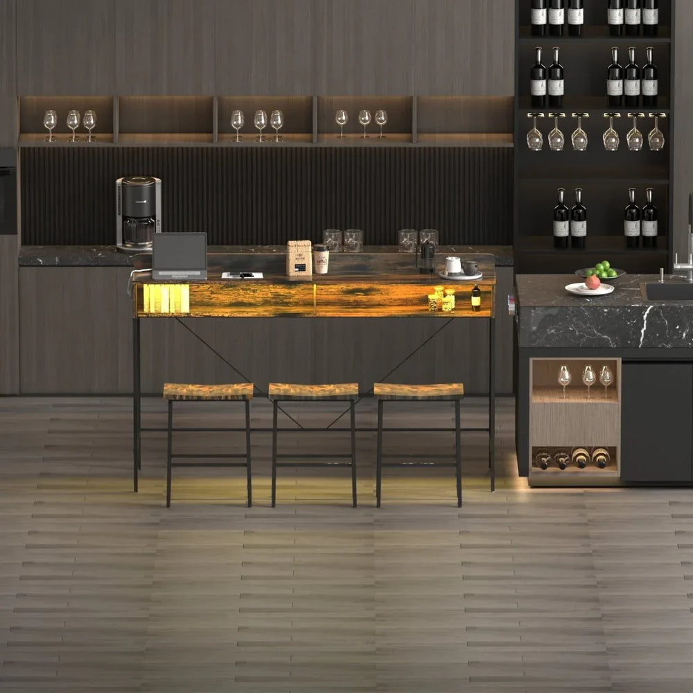 Upgrade your living room, dining area, or kitchen with this versatile 4-piece bar table and chair set. Featuring a 59-inch farmhouse-style bar table crafted from durable MDF and iron, this set offers sturdy support and a stylish brown finish that complements any decor. Designed to fit behind sofas or along walls, the narrow tabletop creates extra workspace or dining area without crowding your room. The set includes three ergonomic saddle stools with curved panels that provide comfortable seating and fatigue relief. With built-in USB, Type-C ports, and AC outlets, plus a multi-color LED mood light strip, this set keeps your devices charged and your space inviting. Practical double-layer ladder shelves add ample storage for decor or essentials, making this bar table an all-in-one solution for functionality and style. Elevate your home productivity and relaxation today.