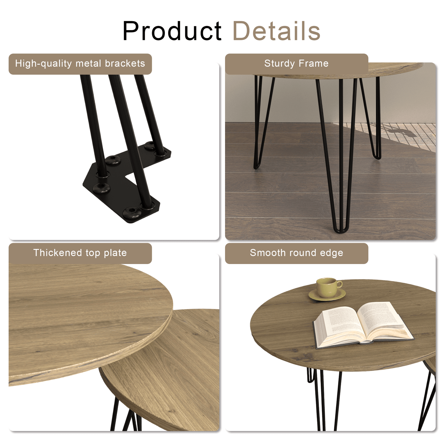 This round nesting coffee table set features high-quality MDF tabletops with imitation marble grain and sturdy metal frames for stable, durable use. Its versatile design suits living rooms, balconies, and small spaces, offering convenient multi-purpose surface area while enhancing relaxation and organization.