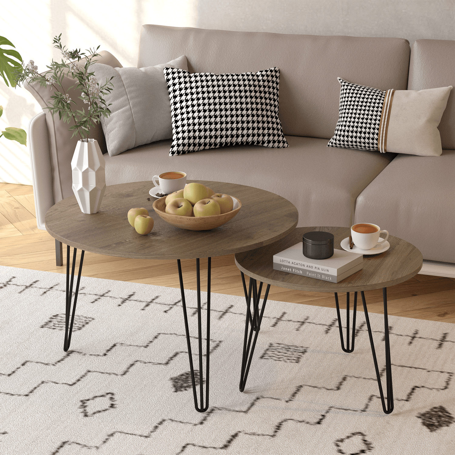 Bring versatility and style into your home with this set of two round nesting coffee tables. Crafted with a sturdy metal frame and a smooth MDF tabletop featuring an elegant imitation marble grain, these tables combine durability with modern rustic charm. The nesting design allows you to arrange the tables together for a spacious surface or separate them to maximize functionality in small spaces. Perfectly sized at 27.56 inches (70 cm) in diameter and 17.72 inches (45 cm) high, these tables are ideal for living rooms, bedrooms, offices, or balconies. Their rounded corners ensure safety, while the rich brown finish adds warmth to any décor. Whether used as coffee tables, side tables, or decorative accents, this set offers flexible and practical furniture solutions. Elevate your home organization and style today.