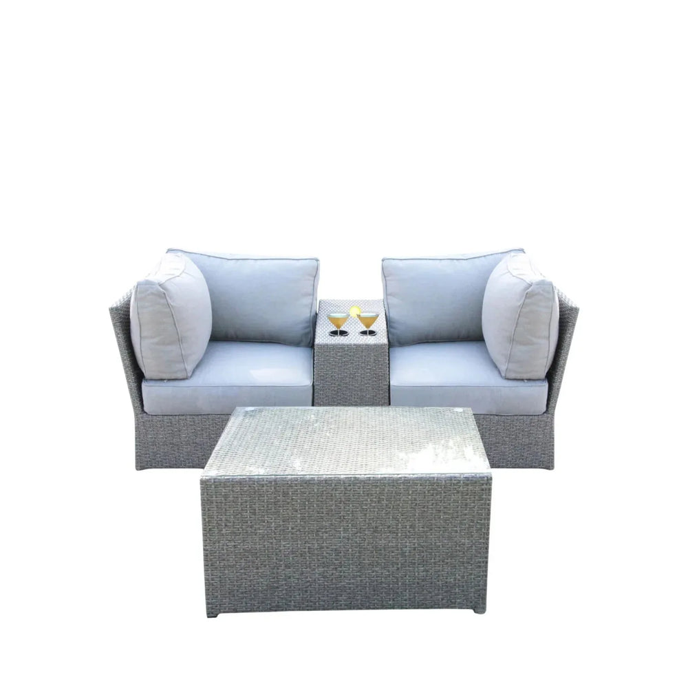Upgrade your outdoor living space with this beautifully crafted 2-person wicker seating set that combines comfort, durability, and modern design. Handwoven from weather-resistant HDPE wicker in an elegant mixed gray finish, the set withstands sun, rain, and other elements while maintaining its charm. Enjoy relaxing on the oversized loveseat featuring ultra-plush 5-inch thick cushions made with foam filling and water-resistant fabric covers that are removable and machine washable. The tempered glass-top coffee table includes convenient built-in cup holders, perfect for drinks or snacks during your outdoor gatherings. Fully assembled and enhanced with a rustproof aluminum frame, this set offers hassle-free setup and long-lasting use. Whether for a patio, balcony, or garden nook, elevate your relaxation today with this versatile outdoor seating solution.