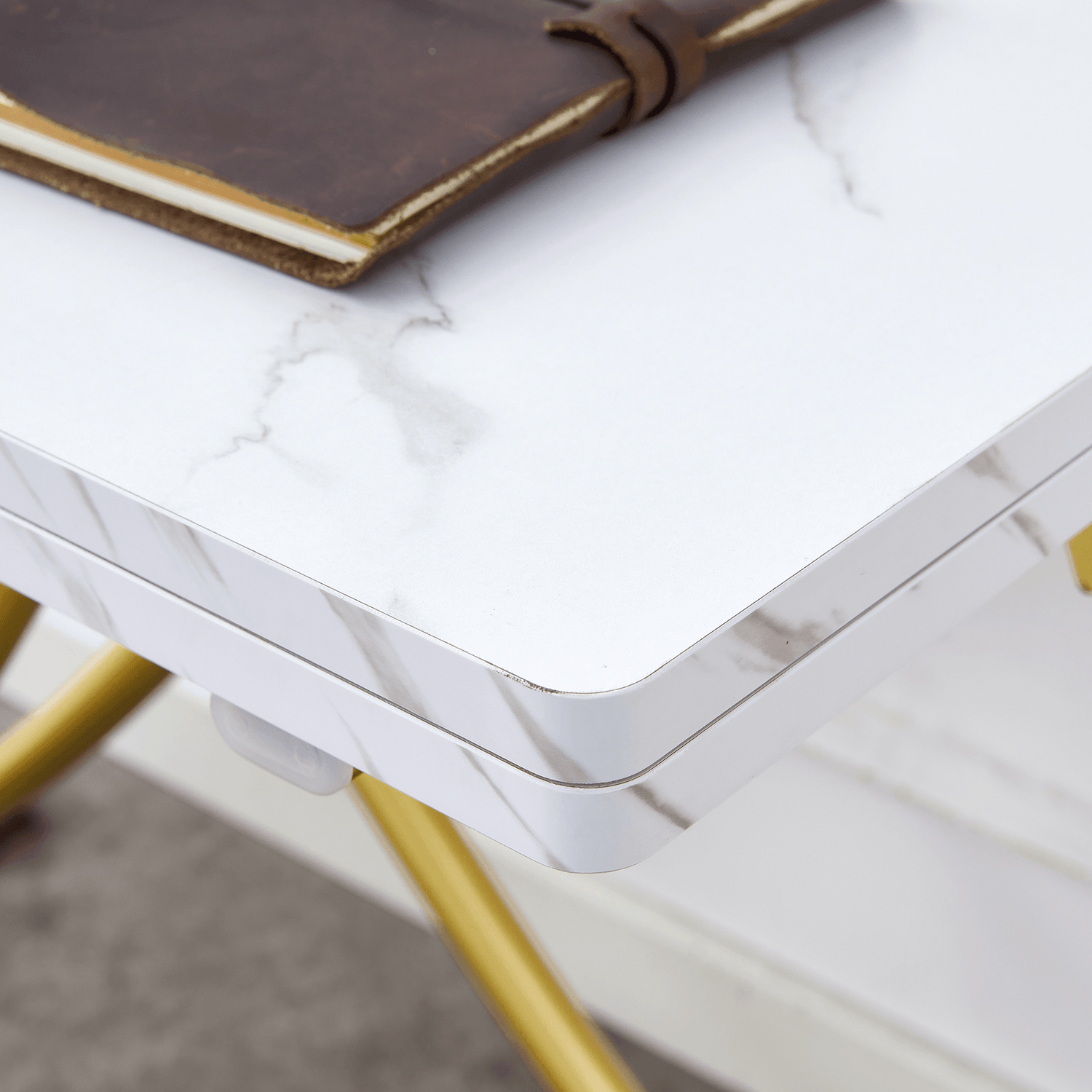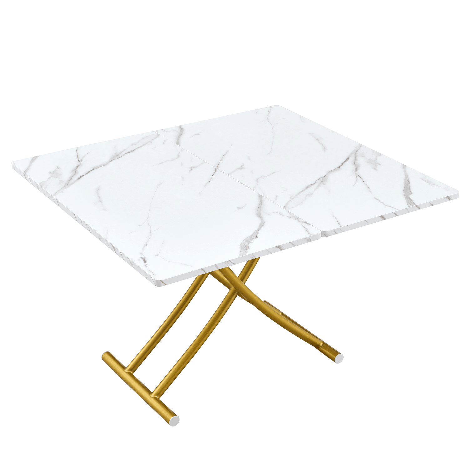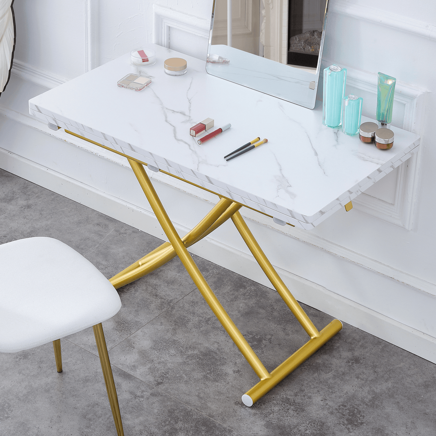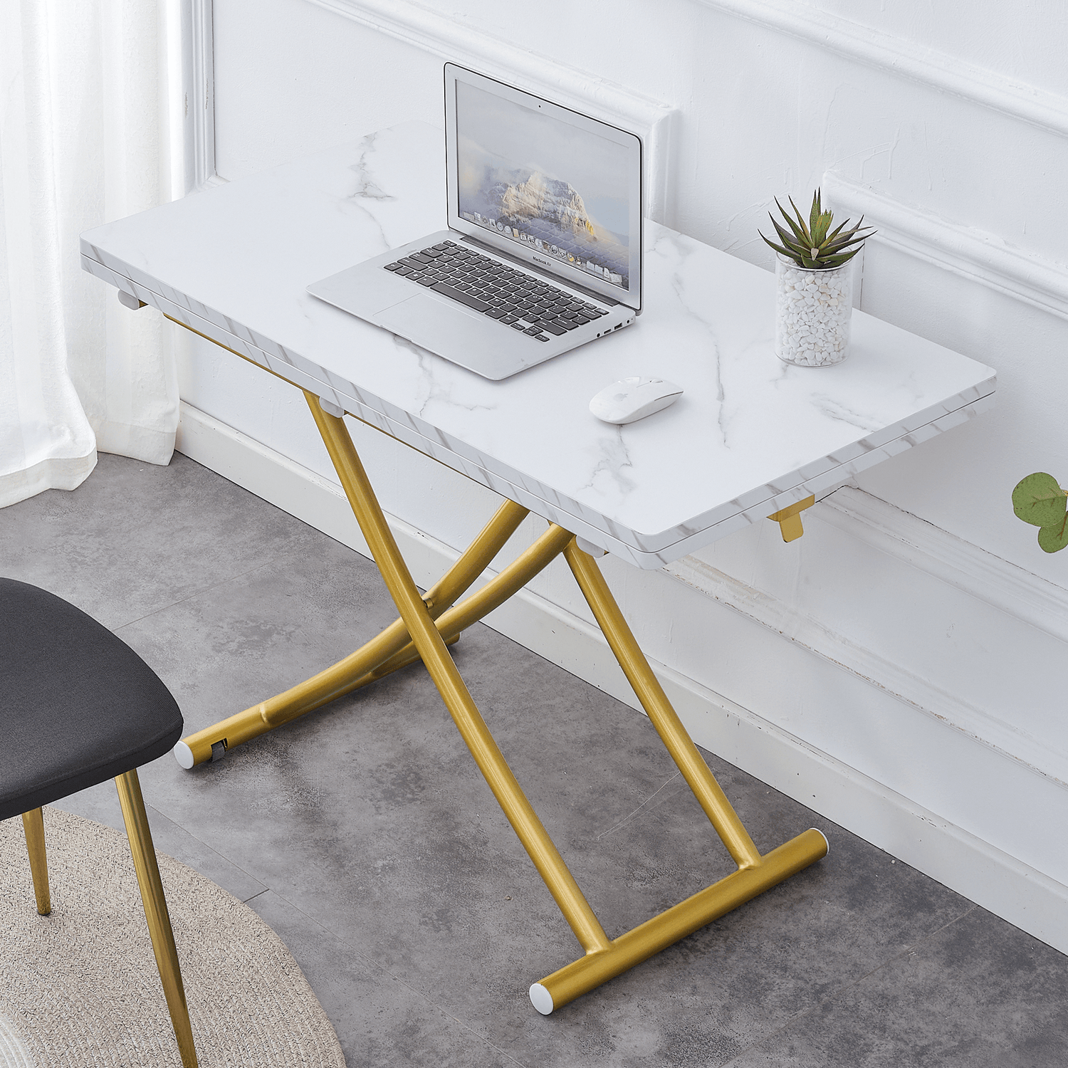 Modern minimalist multifunctional lift table features a 0.8-inch thick MDF desktop with adjustable golden metal legs, offering versatile use as a dining, coffee, office, or dressing table. Easy to fold for space-saving convenience, with smooth rounded edges for safety.