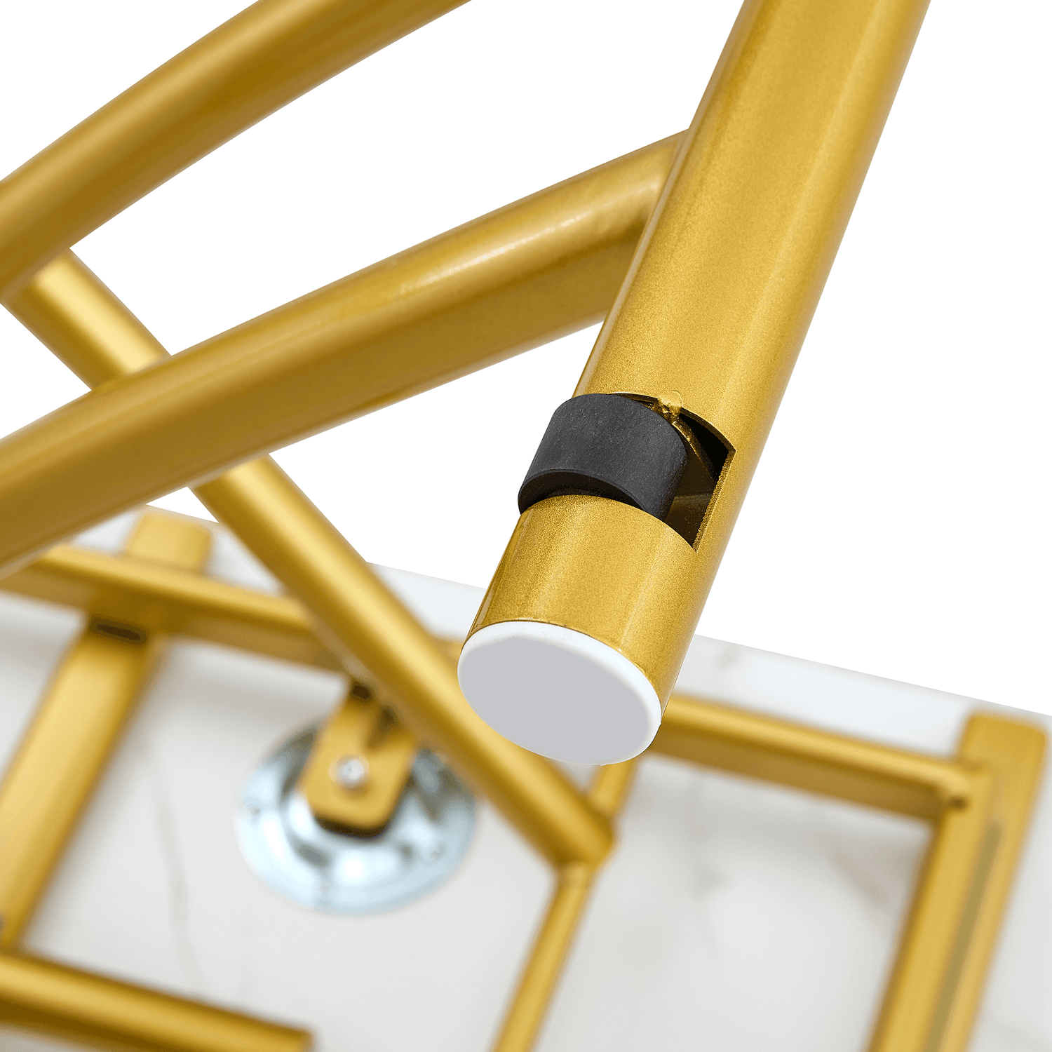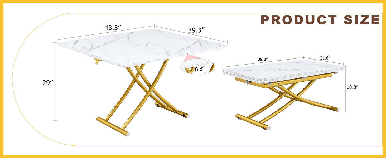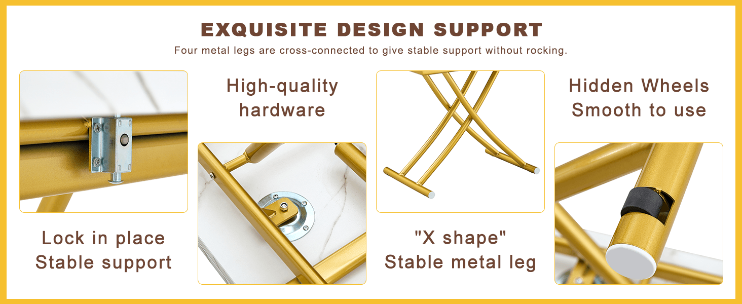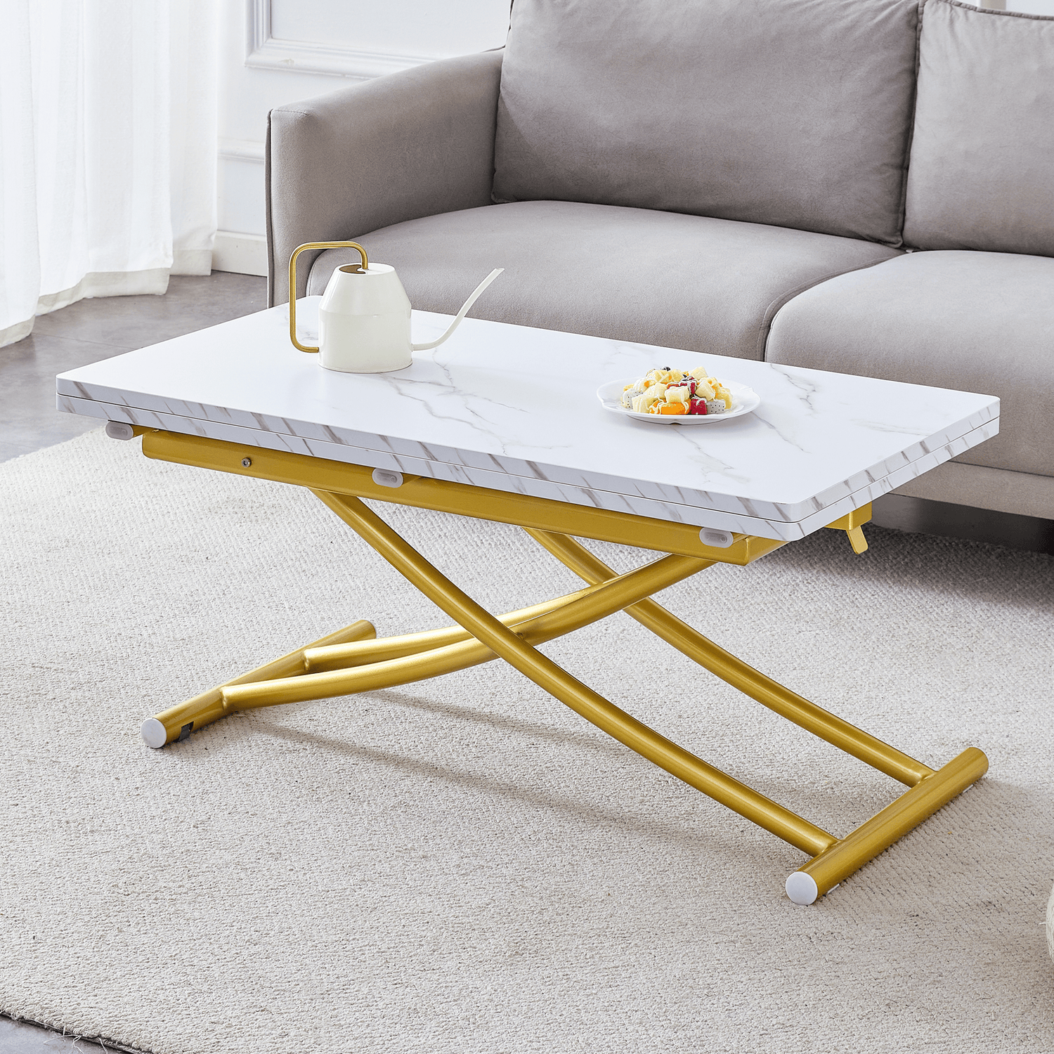 Modern minimalist multifunctional lift table features a 0.8-inch thick MDF desktop with adjustable golden metal legs, offering versatile use as a dining, coffee, office, or dressing table. Easy to fold for space-saving convenience, with smooth rounded edges for safety.