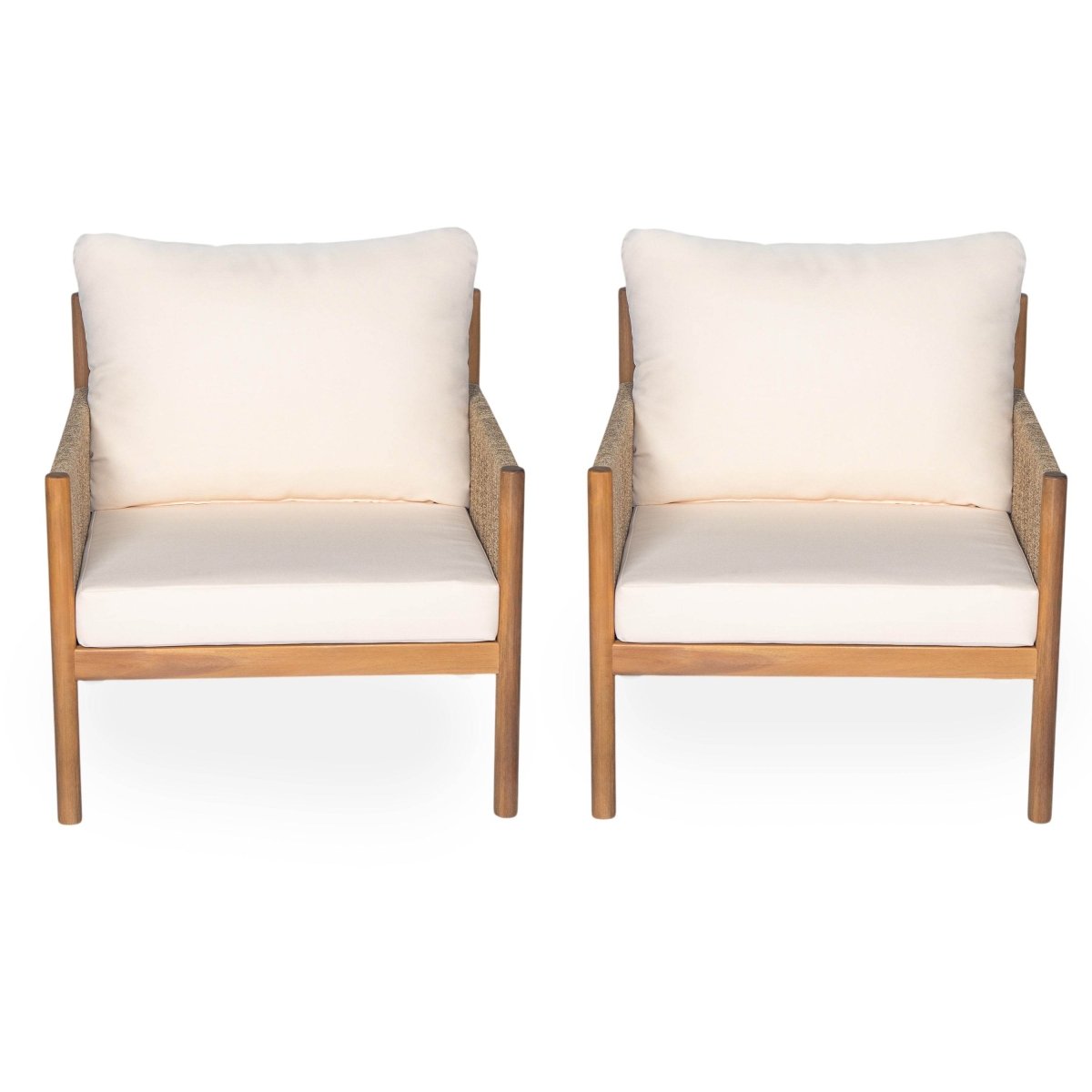 Upgrade your outdoor living space with this set of 2 modern lounge chairs, designed for ultimate relaxation and refined style. Crafted with a solid teak wood frame, these chairs provide sturdy support and timeless beauty that enhances any patio, garden, or balcony. The soft, weather-resistant polyester cushions offer plush comfort while withstanding the elements, making them perfect for year-round outdoor use. Each chair’s generous 28-inch wide seat invites you to unwind with ample space to read, enjoy a drink, or simply relax. Their minimalist, natural design blends seamlessly with both contemporary and classic outdoor settings, elevating your environment with effortless charm. Bring comfort and elegance to your outdoor oasis—elevate your relaxation today.