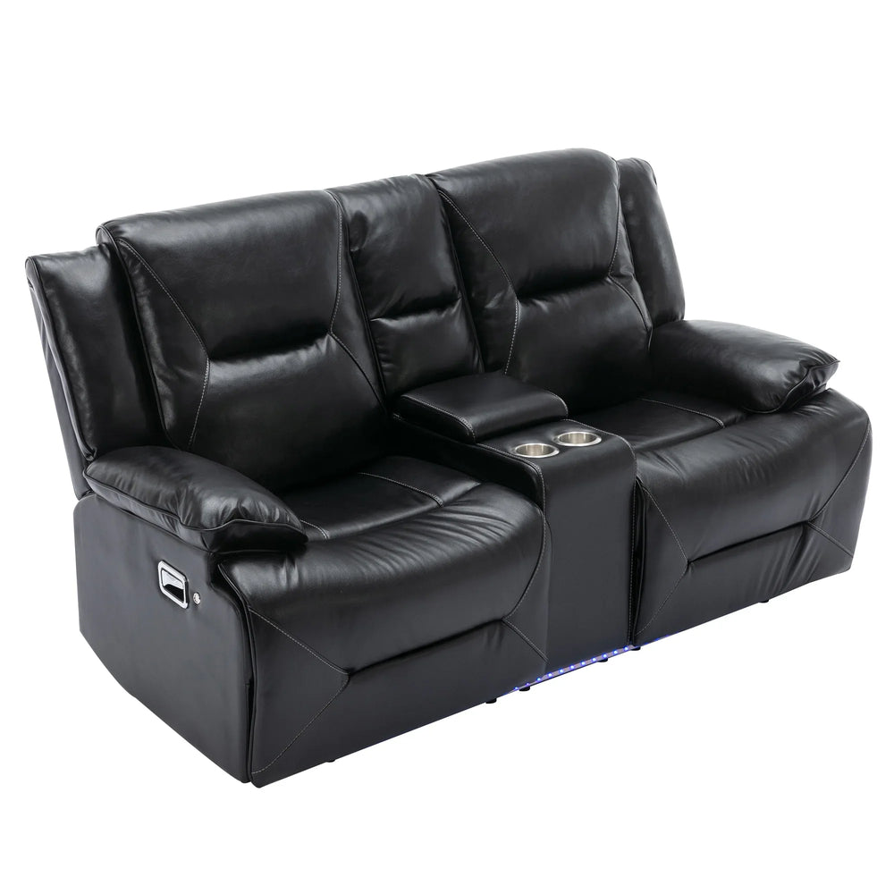 Create the perfect movie night setup with this sleek 2-seater manual recliner chair. Upholstered in durable black leather gel, it offers a smooth, waterproof surface that’s easy to clean and maintain. Adjust effortlessly between multiple reclining positions from 110° to 150°, ensuring personalized comfort whether you’re watching films or relaxing after a long day. The ergonomic design features a wider headrest, thick foam padding, and plush armrests to support your body and enhance relaxation. Integrated LED light strips add a modern ambiance and improve safety in low light. Two built-in cup holders and a convenient storage box keep your drinks and essentials close at hand, minimizing distractions and spills. Crafted with a sturdy iron and plywood frame plus a metal footrest, this recliner supports up to 350 lbs per seat while maintaining stability. Measuring 71.6 inches long, 38.7 inches wide, and 40.5 inches high, it fits perfectly in your living room or bedroom. Elevate your entertainment and unwind in style today.