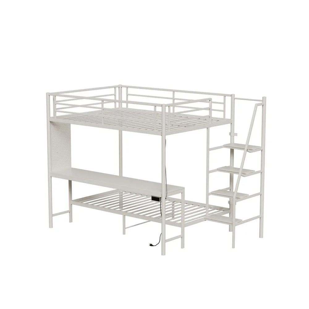 This white full-size bunk bed is the perfect solution for bedrooms needing smart space utilization without sacrificing comfort or style. Crafted with a durable metal frame combined with engineered hardwood, it promises stability and long-lasting use. The top bunk offers a restful full-size sleeping area, while the space below transforms into a multifunctional nook with a built-in desk and convenient charging socket—ideal for studying, gaming, or working. Integrated vibrant RGB LED lights set the mood and create a personalized ambiance in any room. Designed with safety in mind, full-length guardrails and anti-tip hardware provide secure sleeping for peace of mind. Its sturdy structure supports up to 400 pounds, ensuring reliable durability. Elevate your bedroom with this versatile and space-saving bunk bed today.