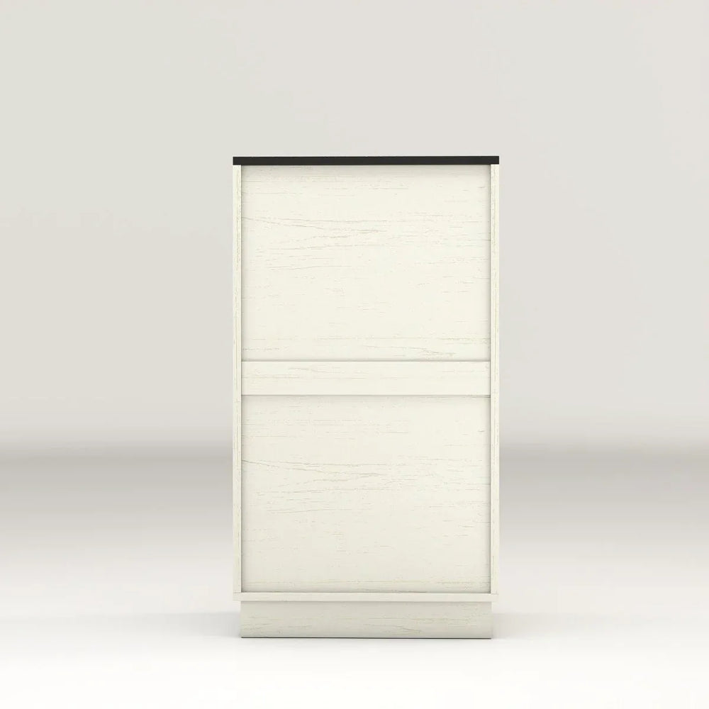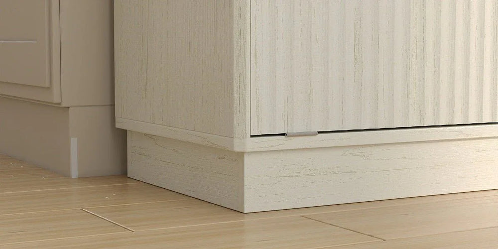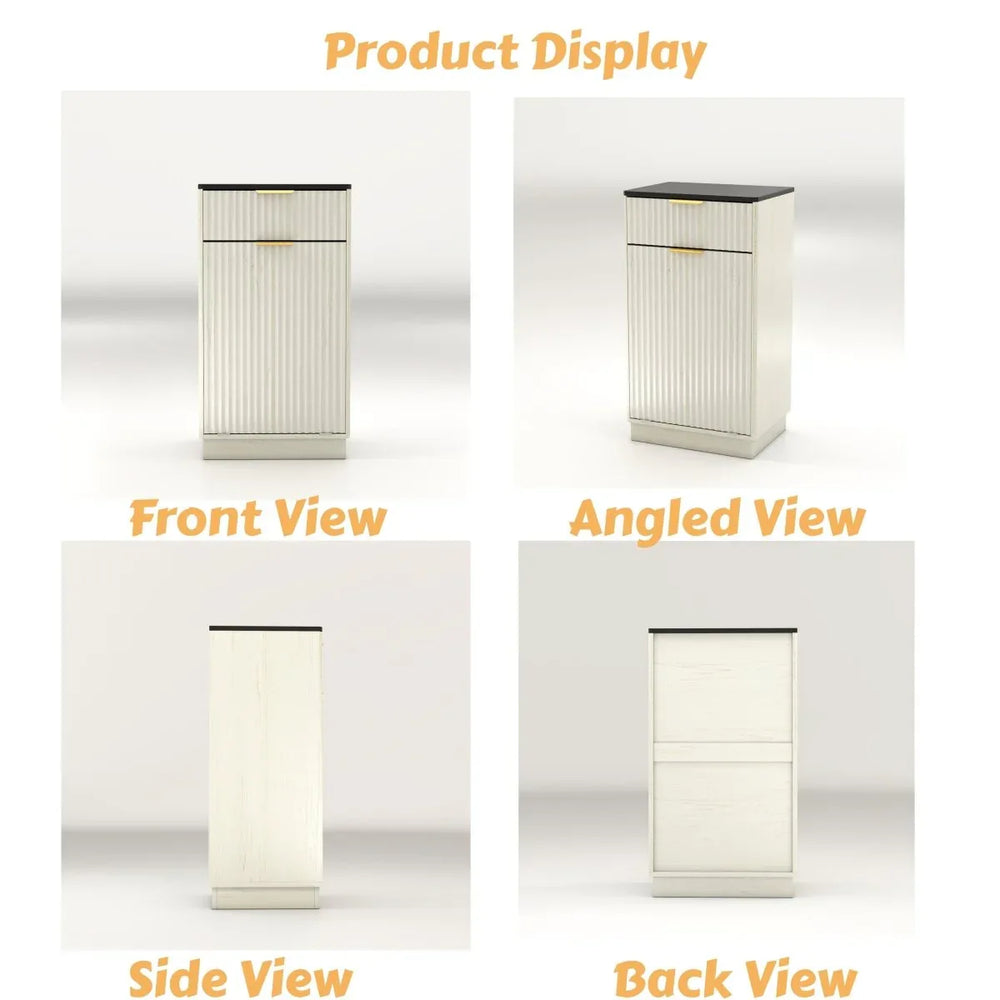 Maximize organization and maintain a clean environment with this sleek woodgrain trash cabinet designed for kitchens, bathrooms, and living rooms. Featuring a smart dual-zone design, the upper wave-textured drawer neatly stores trash bags and cleaning supplies, while the pull-out bin discreetly hides a 13-gallon trash compartment to keep odors contained. Crafted from durable engineered wood with an elegant antique white finish and industrial L-shaped metal handles, this compact cabinet blends functionality with style. Its fully enclosed base and ventilated design prevent moisture buildup, making it ideal for tight spaces like apartments and RVs. Easy to assemble with clear instructions, this versatile cabinet also doubles as a stylish storage table, helping you declutter and elevate your home organization. Elevate your space efficiency today.