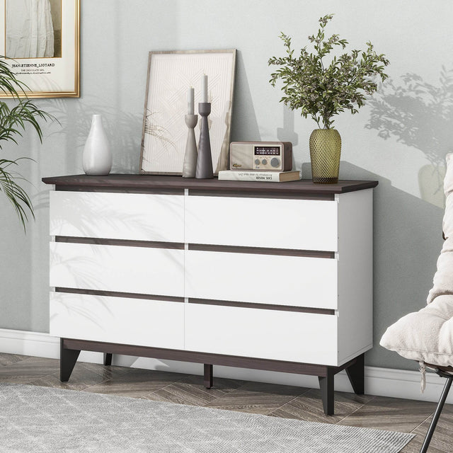 Organize seamlessly with this versatile 6-drawer chest, designed to fit perfectly in bedrooms, living rooms, offices, or apartments. Crafted from sturdy particle board, it offers durable storage and a sleek white finish enhanced with walnut accents for a modern touch. Each drawer provides generous space to store clothing, toys, books, or personal items, helping you maintain a clutter-free environment. The spacious top surface is ideal for displaying lamps, photos, or plants, doubling as an entertainment center under your wall-mounted TV. With dimensions of 47.2 inches wide, 15.7 inches deep, and 30.7 inches high, this cabinet fits snugly in smaller spaces while offering maximum storage capacity. Elevate your organization and style today.