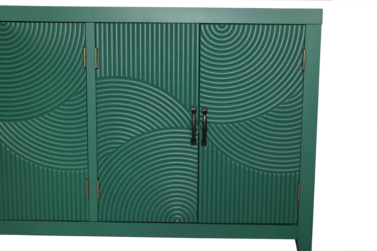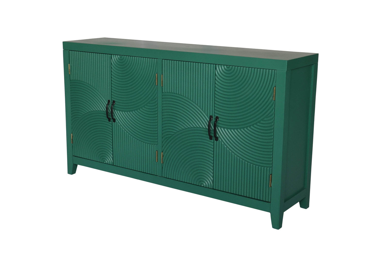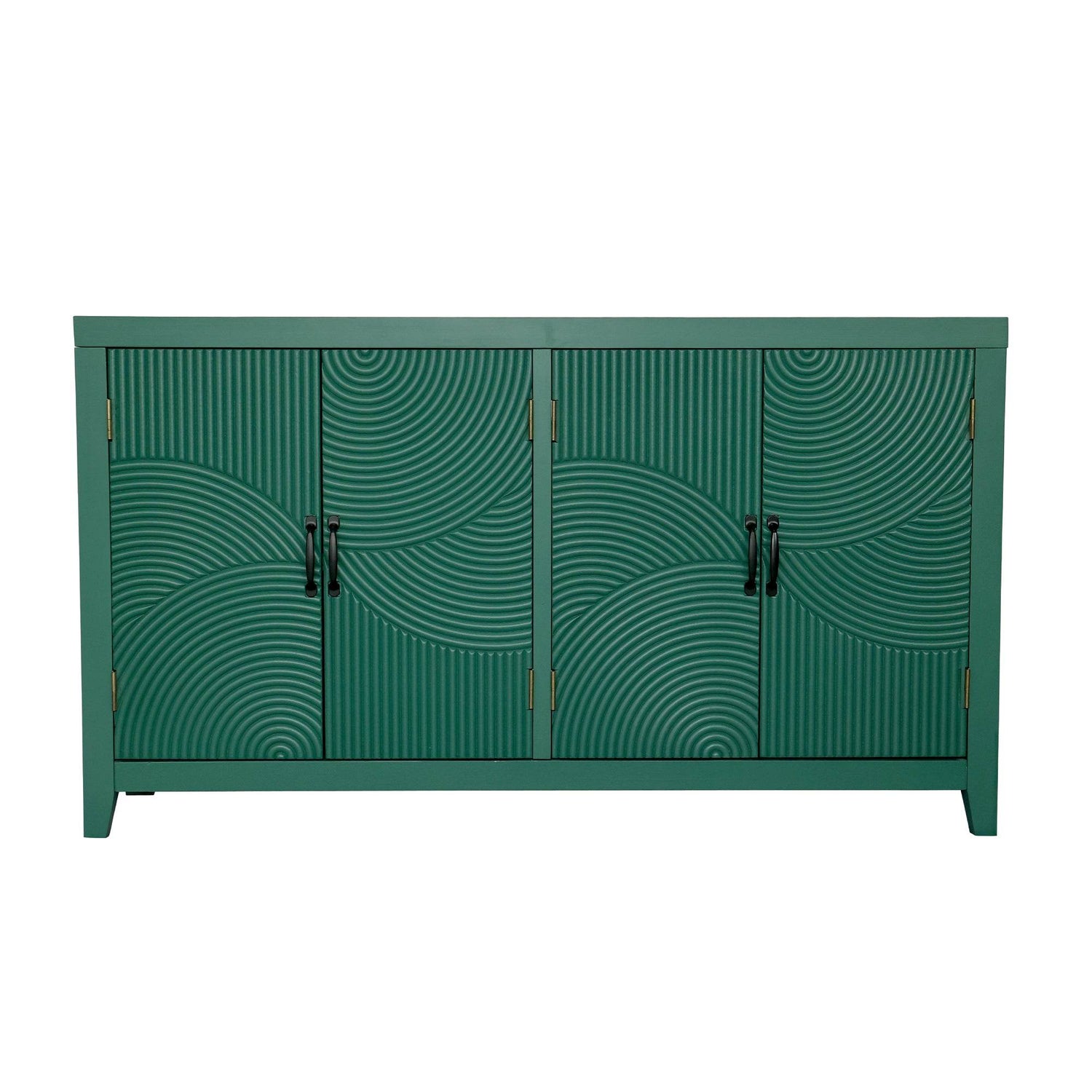 Bring timeless style and functional storage to any room with this 59-inch Green Accent Cabinet. Featuring a vintage-inspired design, its rich dark green painted finish and intricate carved doors add an elegant touch to your entryway, dining room, or living space. Crafted from durable MDF and fir wood, this cabinet offers a sturdy build with a spacious top surface perfect for displaying decor or essentials. Inside, customizable shelving adapts to your storage needs, letting you organize items of various sizes with ease. The metal handles complement the mid-century modern aesthetic, creating a striking yet practical piece that enhances any interior. Weighing approximately 72 pounds, this accent chest balances robust construction with stylish appeal. Elevate your home organization and décor today with this versatile buffet cabinet.