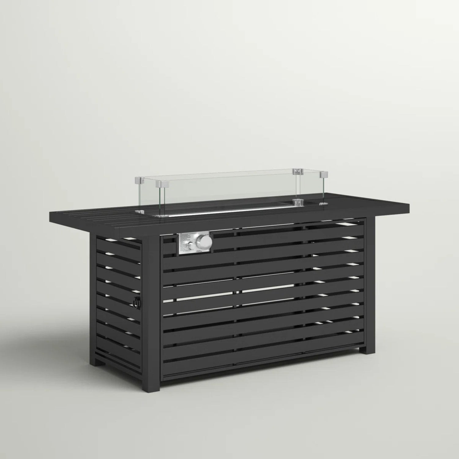 Turn your patio into a warm, inviting retreat with this durable steel propane fire pit table. Its sleek black finish and slatted base offer a modern, airy design that complements any outdoor setting. Featuring a powerful 50,000 BTU propane-fueled fireplace with easy push-button ignition and adjustable flame control, it provides customizable warmth and ambiance. The included lid, polyester cover, lava rocks, and glass fire beads create a polished, hassle-free experience, while the surrounding ledge is perfect for drinks and snacks. Built to withstand the elements, this heatproof fire pit is safe for wooden decks and comes with a protective glass shield for added safety. Lightweight yet sturdy at 52 pounds, it assembles quickly with all necessary tools included. Elevate your outdoor gatherings with cozy warmth and style today.