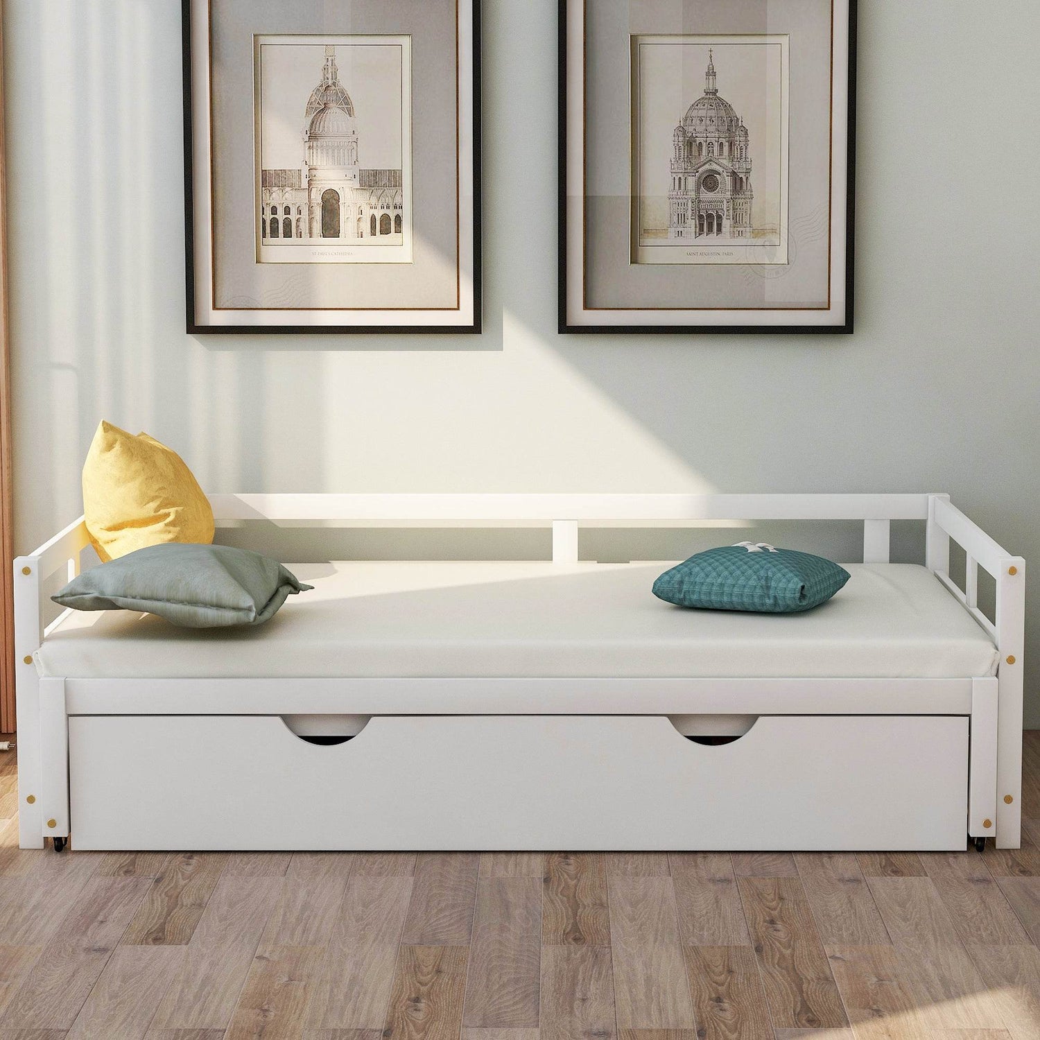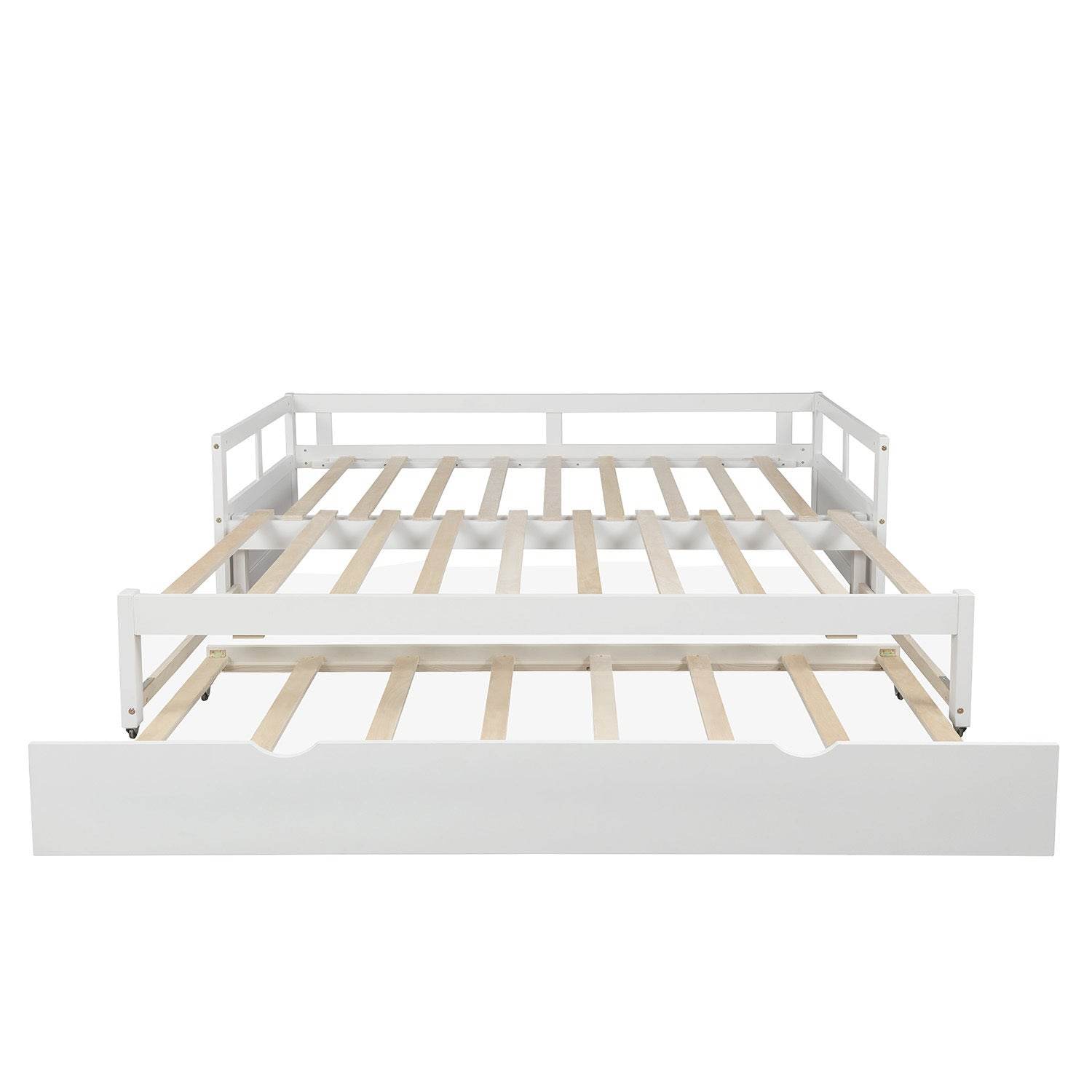 Perfect for homes that value both style and functionality, this extending daybed with pull-out trundle offers versatile sleeping arrangements without sacrificing space. Crafted from high-quality solid pine wood with a durable frame and legs, it ensures lasting stability and support. The twin-sized daybed easily transforms into a king-sized sleeping area when the trundle is extended, providing flexible accommodations for guests or family members. Designed with 19 slats on the upper bed and 8 on the trundle, it supports your mattress without the need for a box spring while promoting airflow to keep your mattress fresh. Featuring smooth casters, the trundle glides out effortlessly, making setup quick and hassle-free. Its clean silhouette and neutral white finish complement any bedroom décor, completing your space with understated elegance. Assembly is required, but clear instructions and tools are included. Elevate your home’s sleeping versatility today.