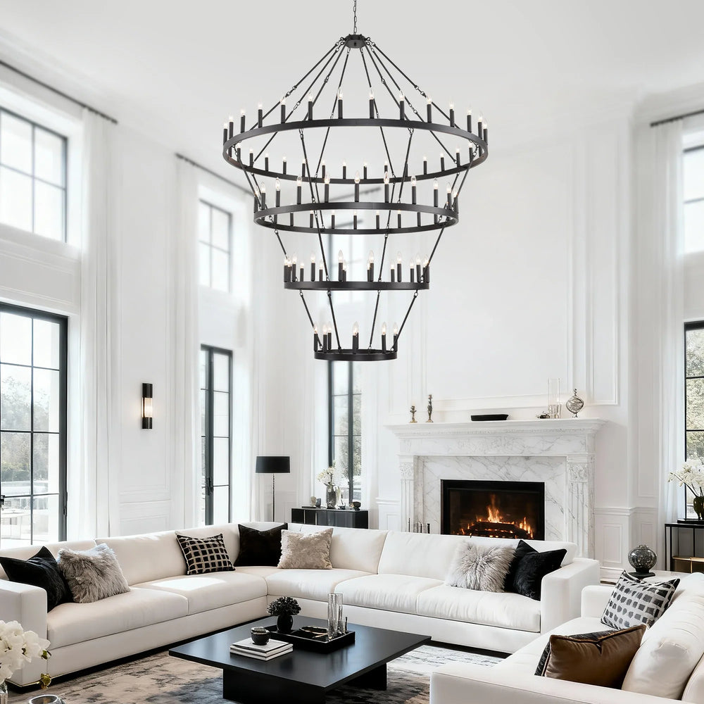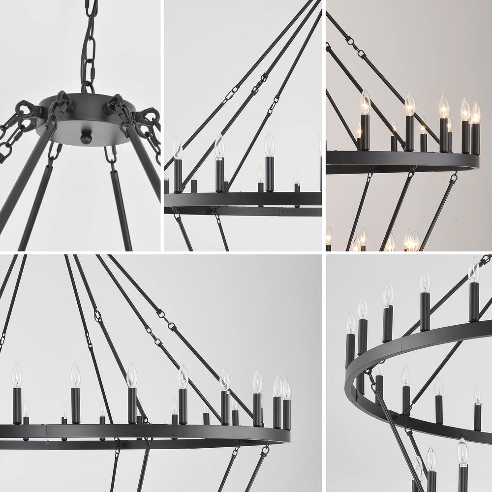 Illuminate your living space with this striking 4-story wagon wheel chandelier, designed to blend farmhouse charm with contemporary sophistication. Measuring 70.87 inches (180 cm) in both length and width, this large-scale ceiling light fixture commands attention while providing a warm, inviting atmosphere. Crafted from durable iron and metal with a matte black finish, it complements American traditional and modern décor styles perfectly. The 60 E12 sockets offer 360° light coverage, allowing you to customize your brightness with a variety of bulb types (not included). Adjustable chains let you tailor the hanging height to fit high ceilings in dining rooms, foyers, or living spaces. Easy to install with pre-assembled lamp body, this chandelier offers a seamless upgrade to your home ambiance. Elevate your interior with farmhouse industrial lighting that’s both functional and visually captivating.
