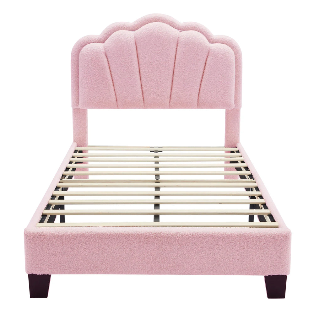 Elevate your bedroom with this enchanting twin bed featuring an elegant flower-shaped headboard upholstered in soft sherpa fabric. The unique floral silhouette adds artistic charm while creating a warm, cozy atmosphere perfect for restful nights or relaxed reading. Integrated LED light strips with adjustable brightness enhance ambiance, allowing you to set a romantic or calming glow effortlessly. Crafted from durable MDF, plywood, and reinforced by sturdy metal legs and 10 wooden slats, this platform bed offers excellent stability and supports mattresses up to 10 inches thick. Its adjustable headboard height adapts to your mattress thickness to ensure perfect comfort and style. Measuring 79.1 inches long by 40.5 inches wide and 44.1 inches high, this lightweight 54-pound bed blends classic modern design with kid-friendly appeal. Upgrade your sleep space with both functionality and flair. Elevate your relaxation today!