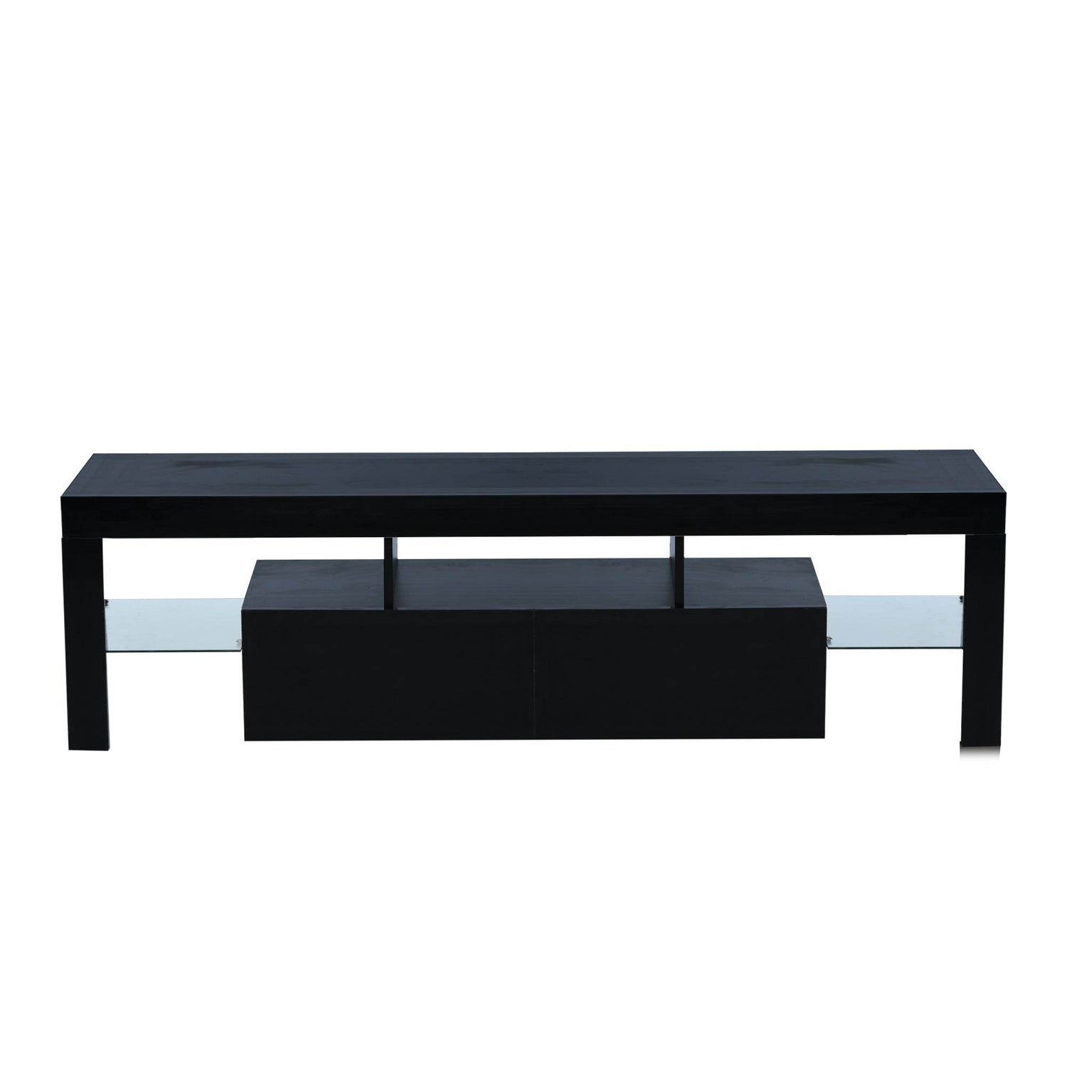 Classic black TV stand features durable particle board and foam-filled drawers, supporting up to 110 pounds and fitting TVs up to 65 inches. It includes 16 RGB LED backlights with remote control for adjustable ambiance, ideal for primary living spaces.