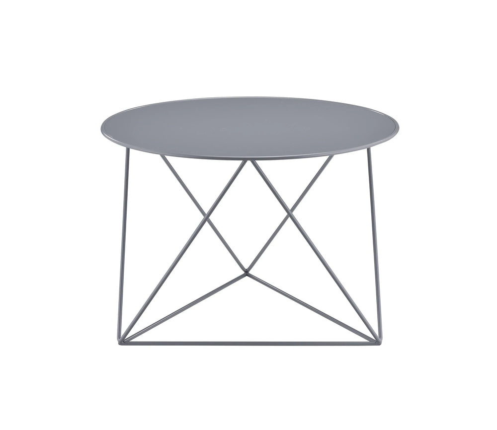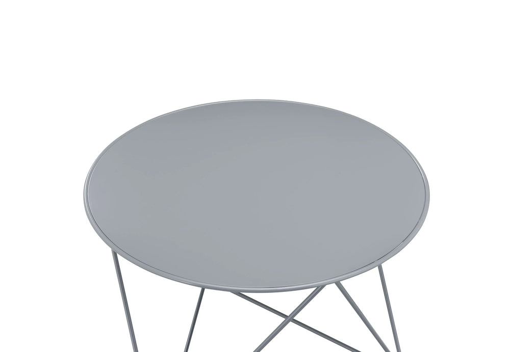 This gray metal accent table features a round top and triangle-shaped legs, combining sturdy construction with lightweight portability. Ideal for living rooms or home offices, it adds modern style while offering versatile display and utility functions.